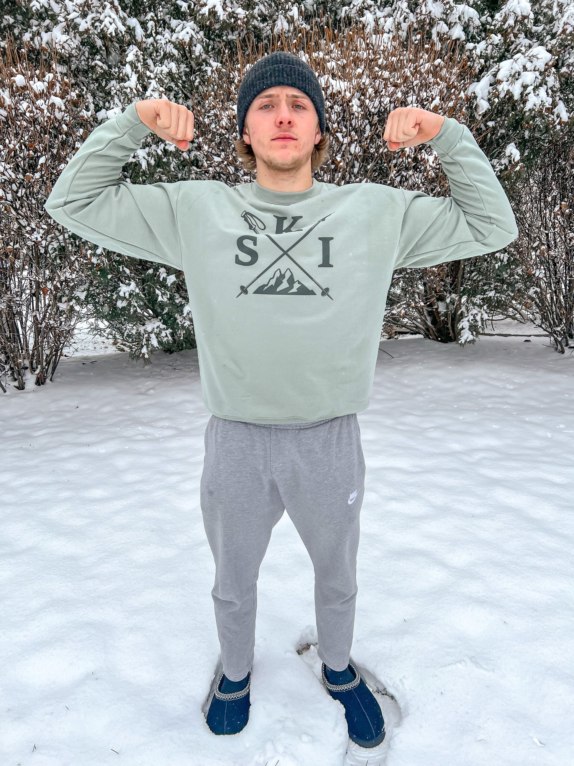 Introducing the SKI sweatshirt - perfect for cozy winter days on the slopes. This stonewashed green sweatshirt sports a playful mountain graphic, making it a fun addition to your winter wardrobe. Hit the slopes in style and comfort with SKI!