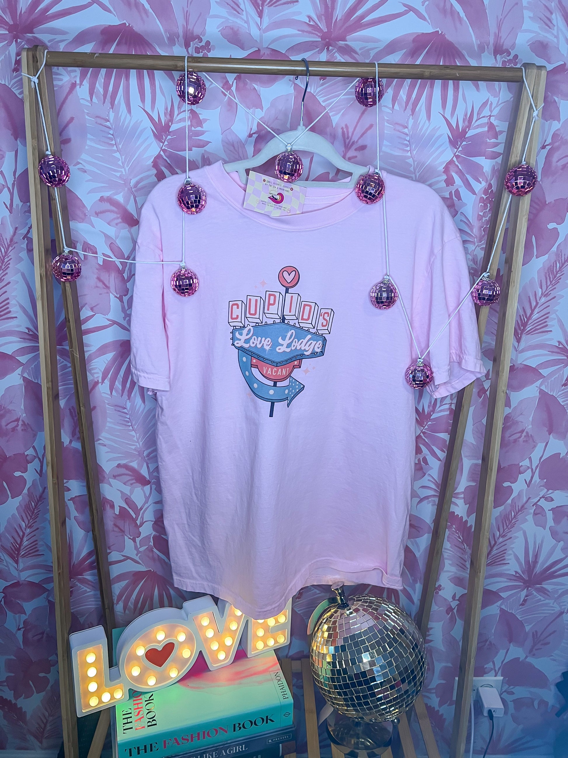 Get ready to spread love with Cupid's Love Lodge tee! This light pink and soft tee is the perfect cute outfit for Valentine's Day.