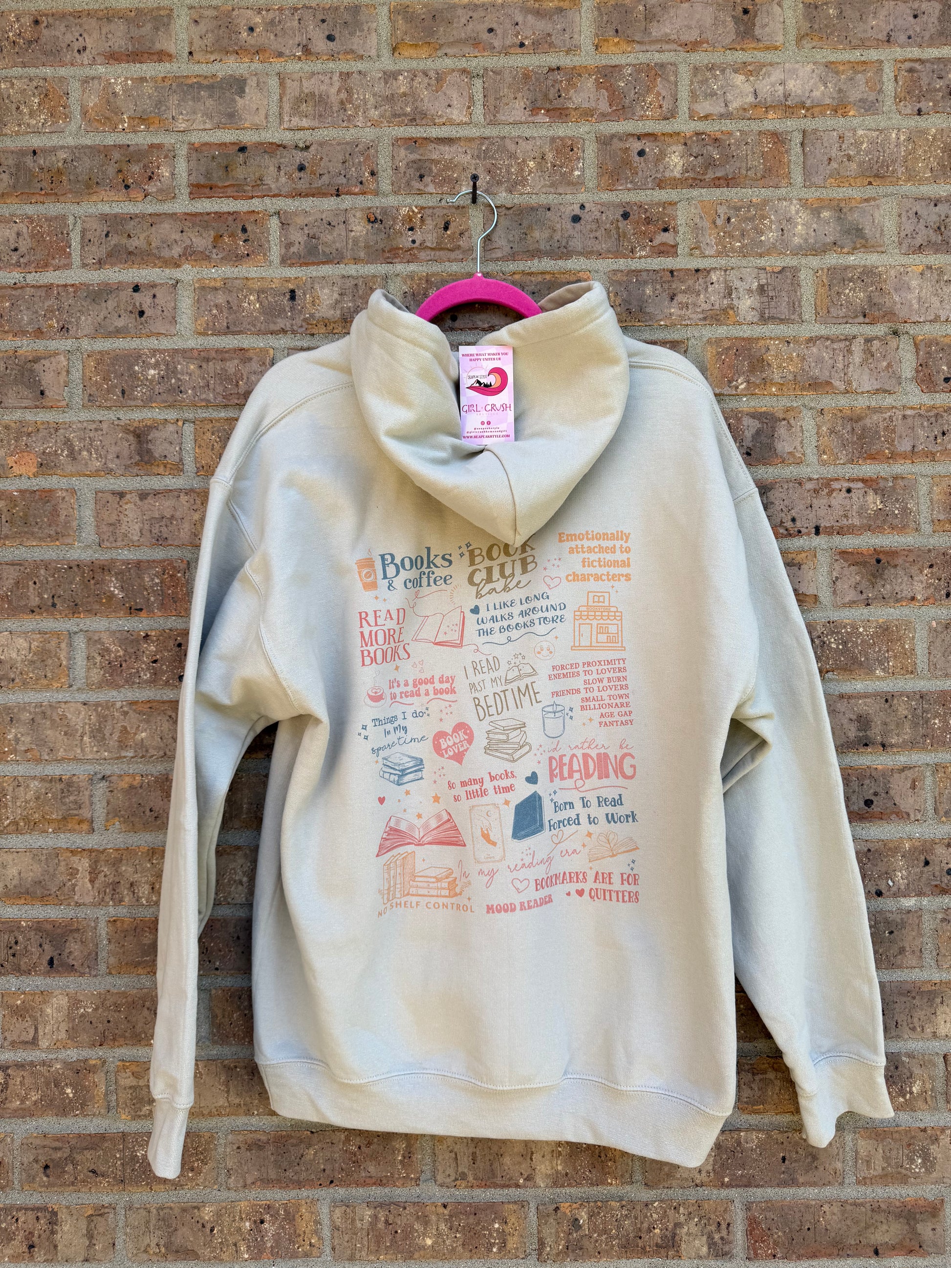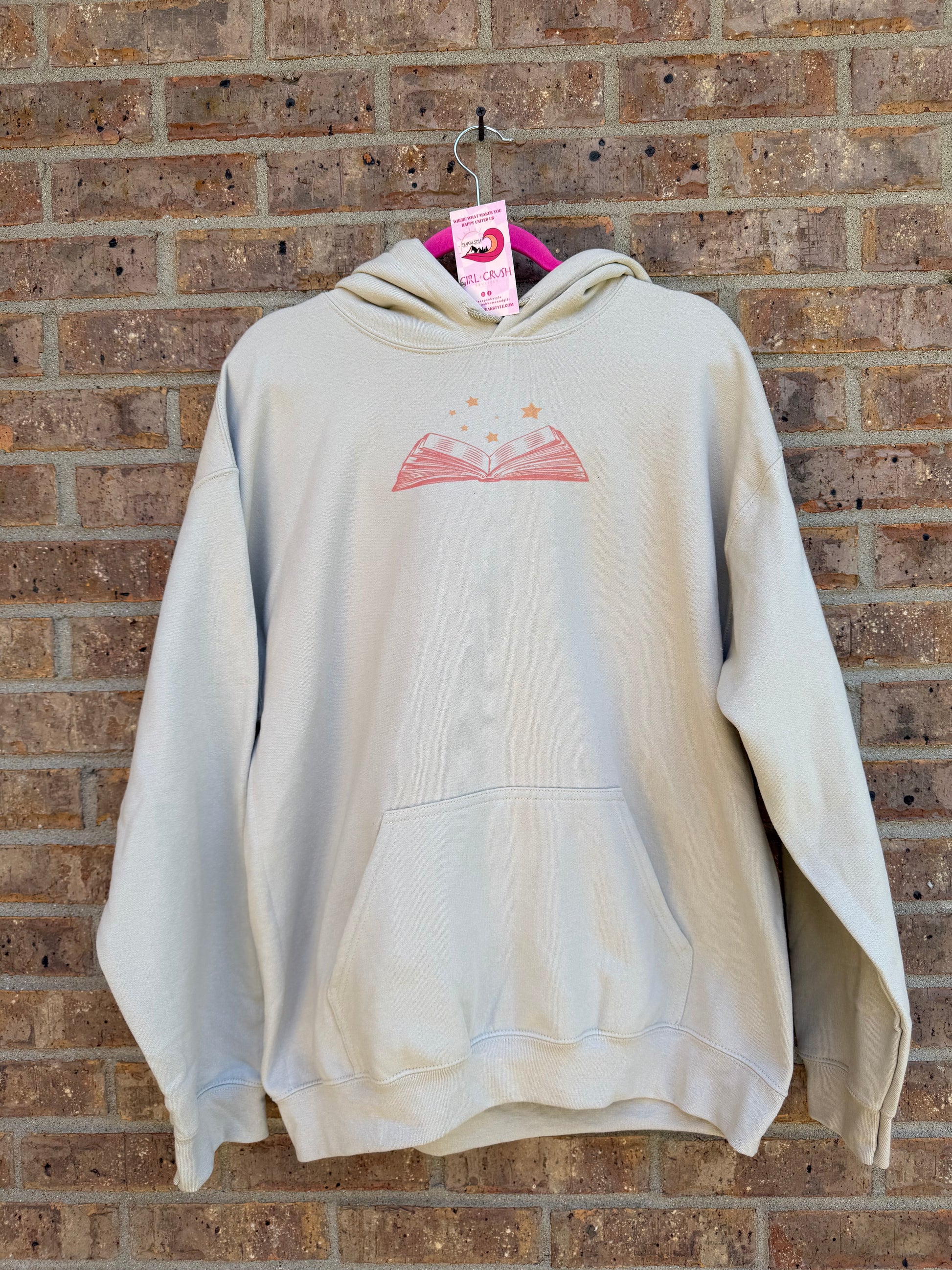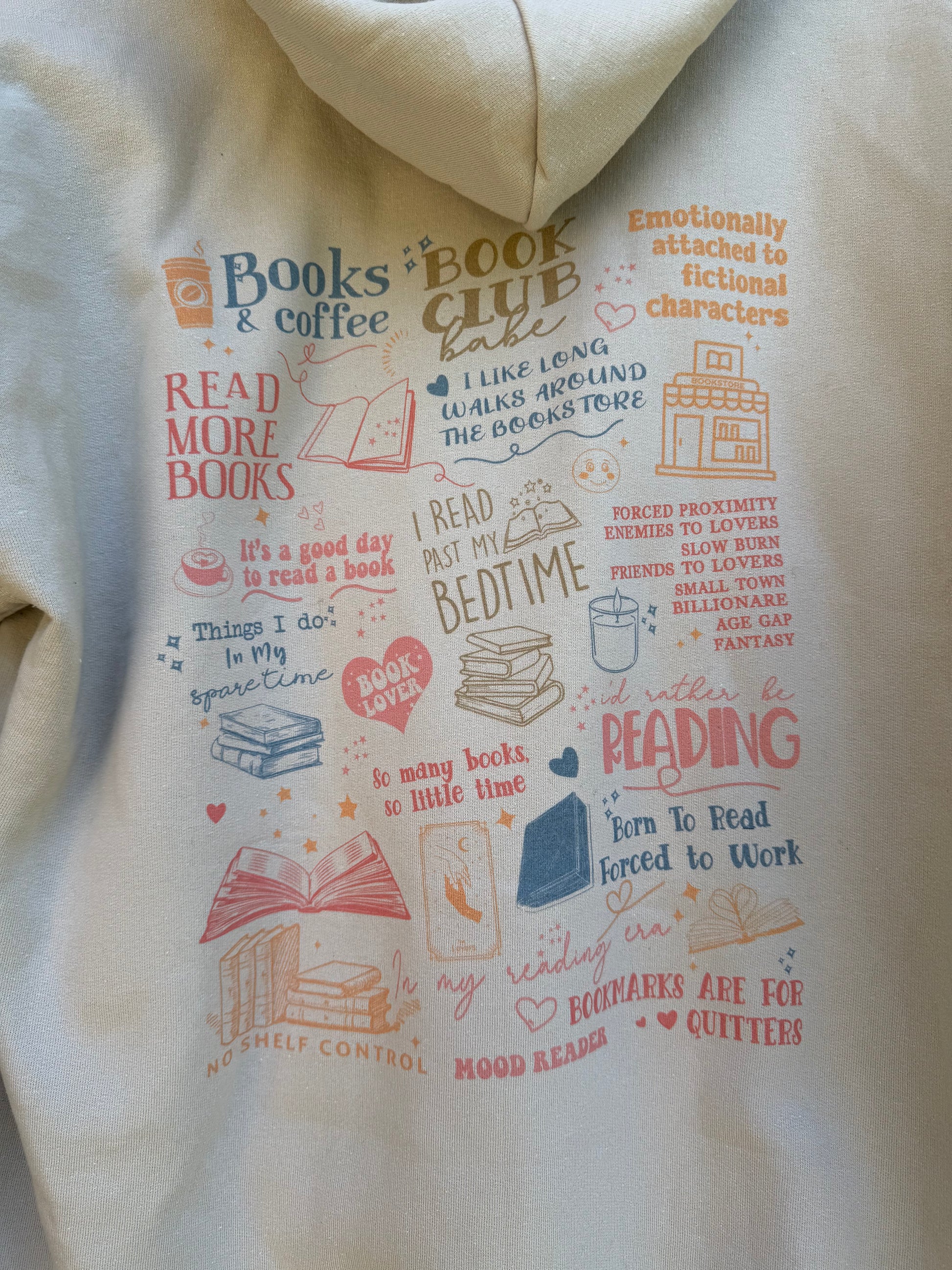 Step into a world of bookish charm with our Storybook Collage Hoodie. Featuring a dreamy open book design on the front and a playful collection of book-themed doodles and quotes on the back, this cozy beige hoodie is perfect for readers and daydreamers alike.