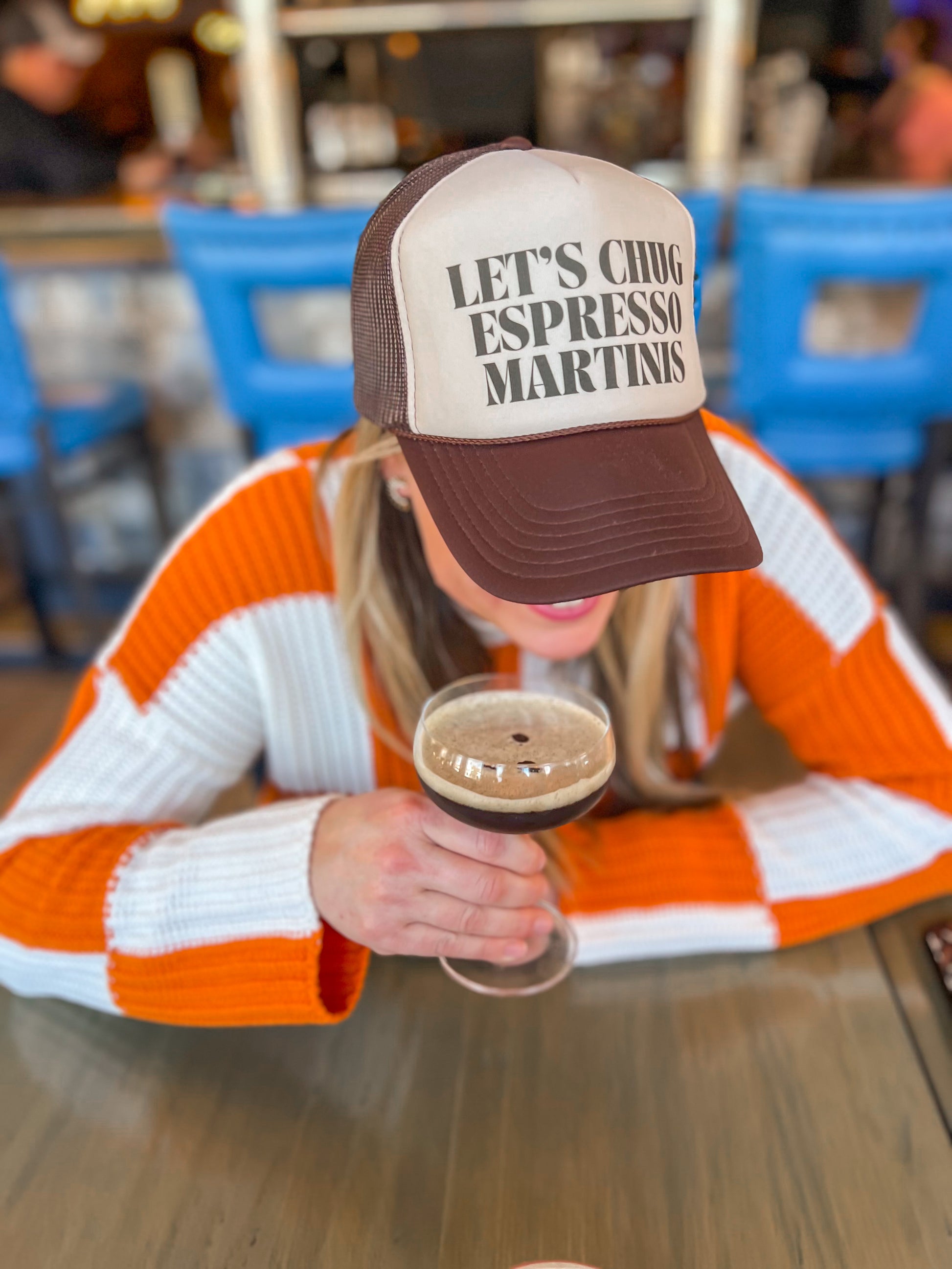 Take your love for espresso martinis to the next level with our Espresso Martini hat! This stylish, brown and beige hat features the phrase “let’s chug espresso martinis” making it the perfect accessory for any cocktail lover. So don't just sip, let's chug espresso martinis 🍸 ☕️