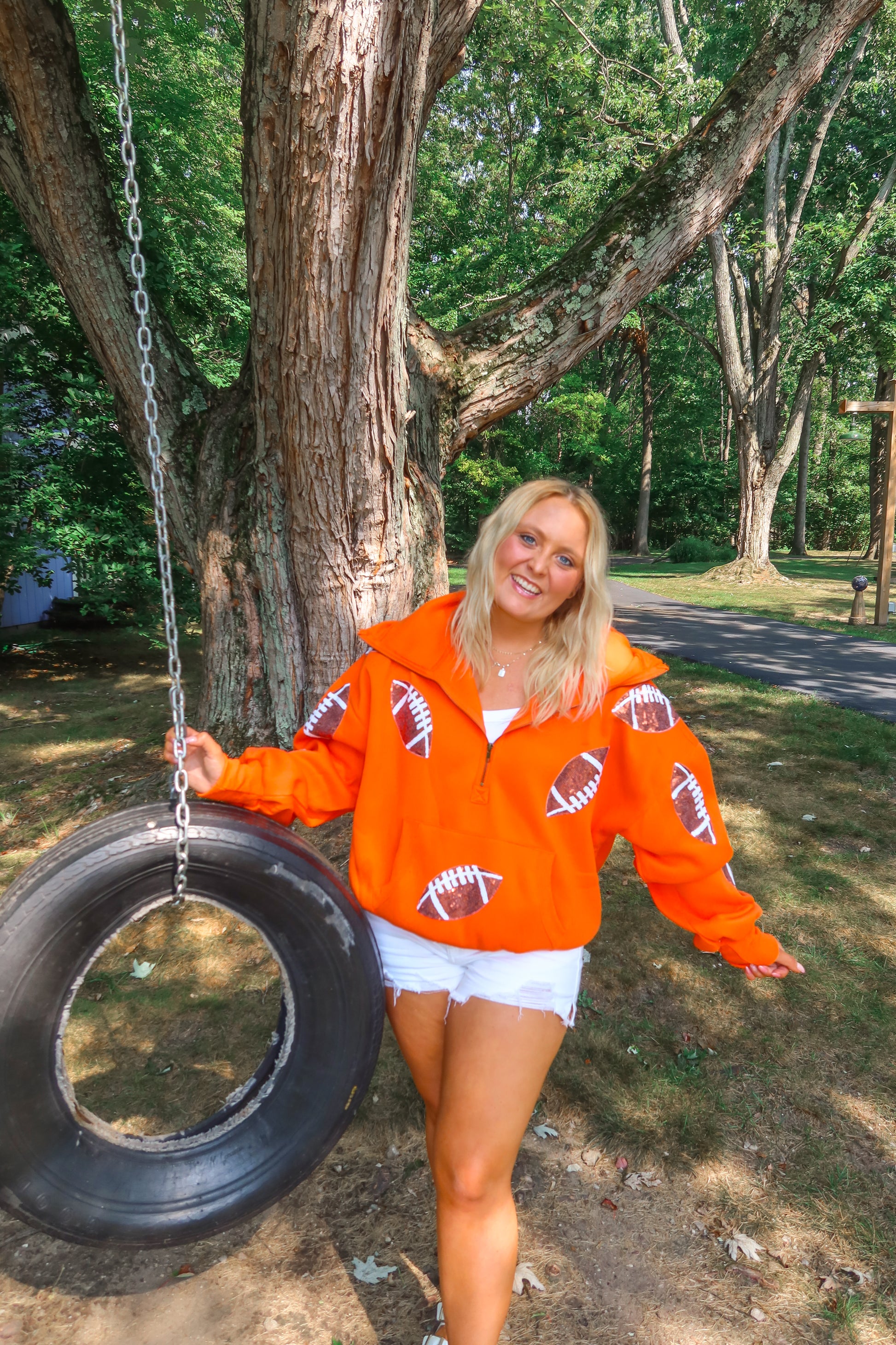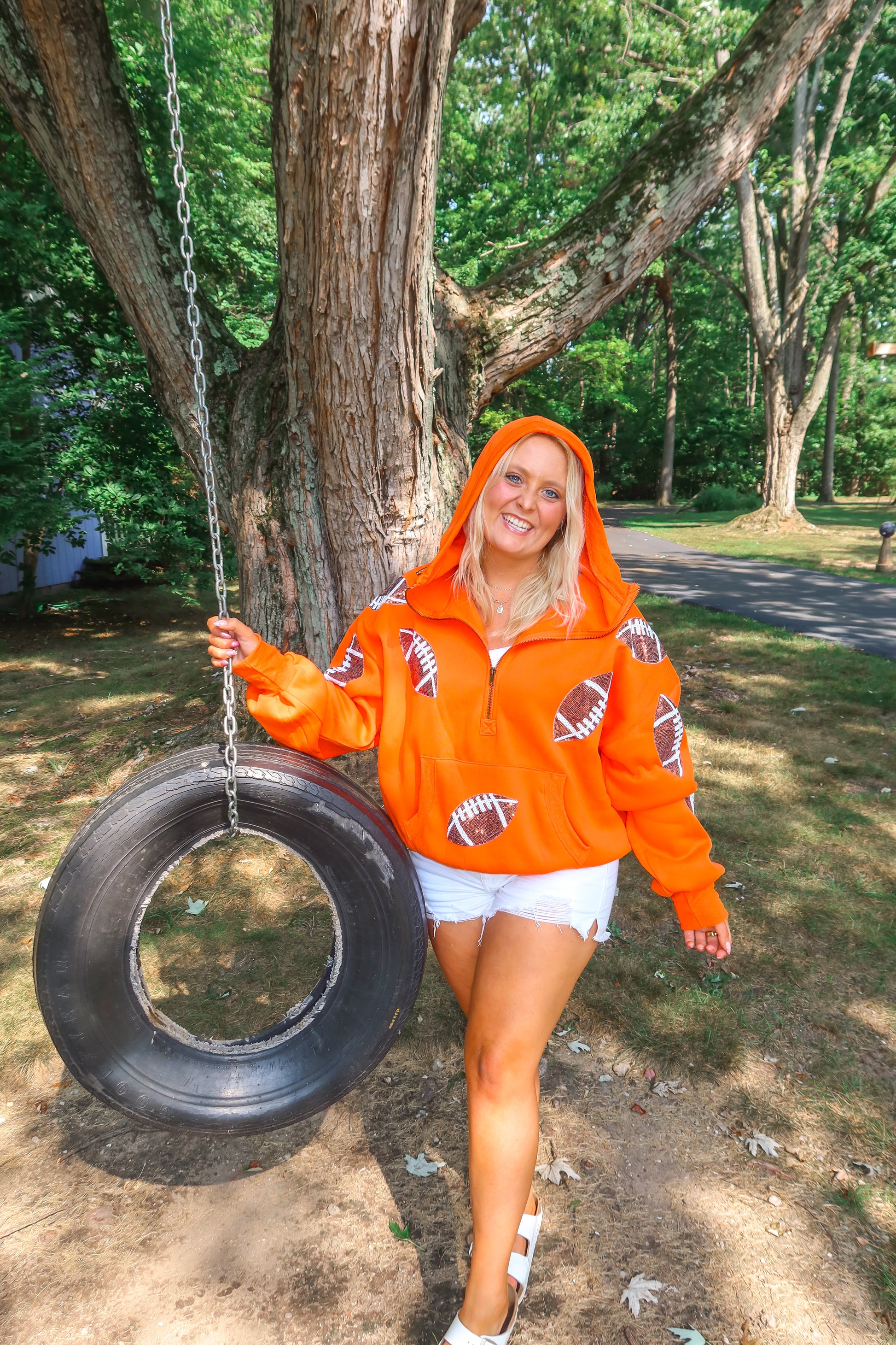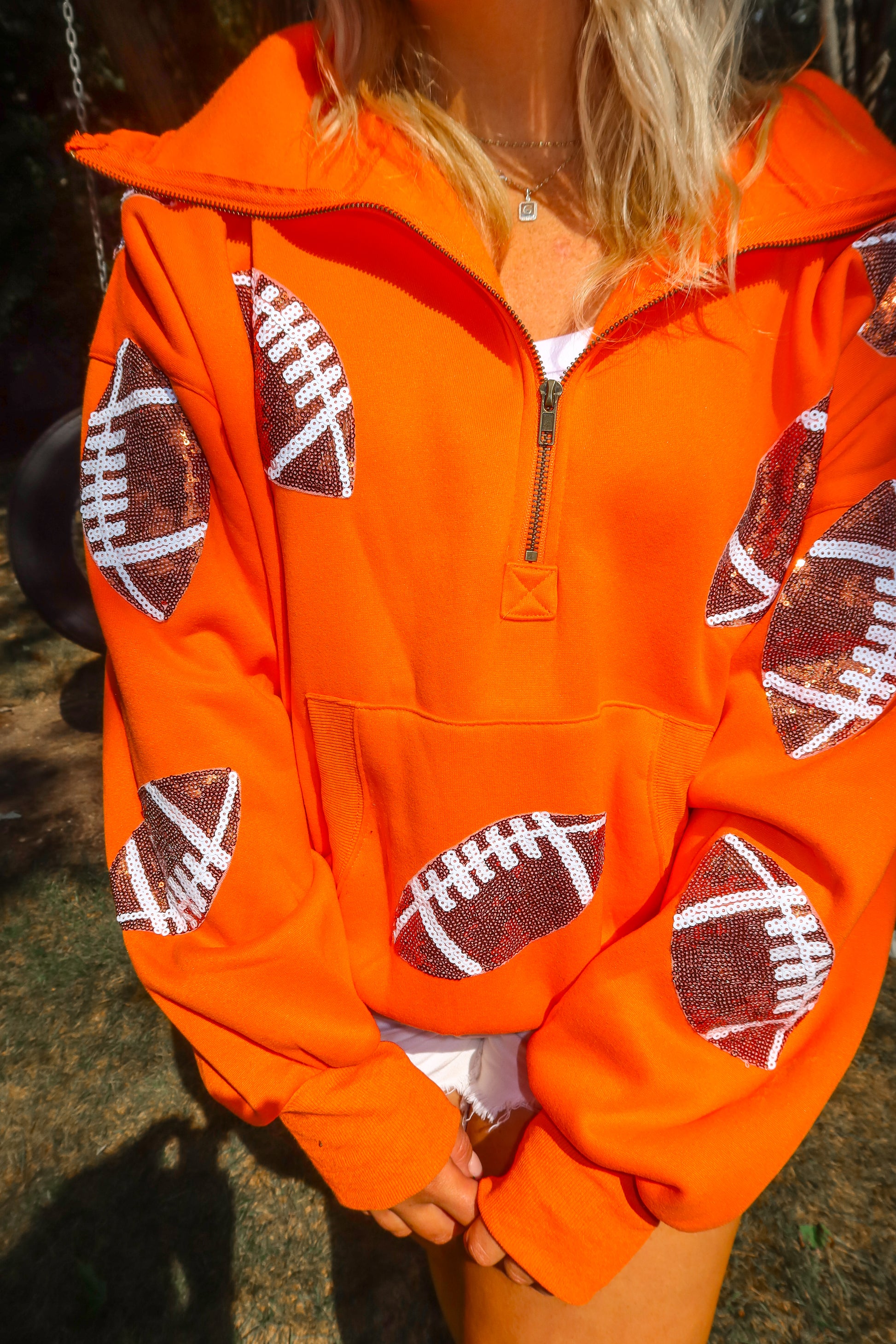 Score major style points this season with our Orange Glitter Football Quarter Zip Hoodie! This vibrant gameday pullover is covered in sparkling glitter footballs, making it the ultimate statement piece for cheering on your favorite team — whether it’s college football, NFL Sundays, or Friday night lights.