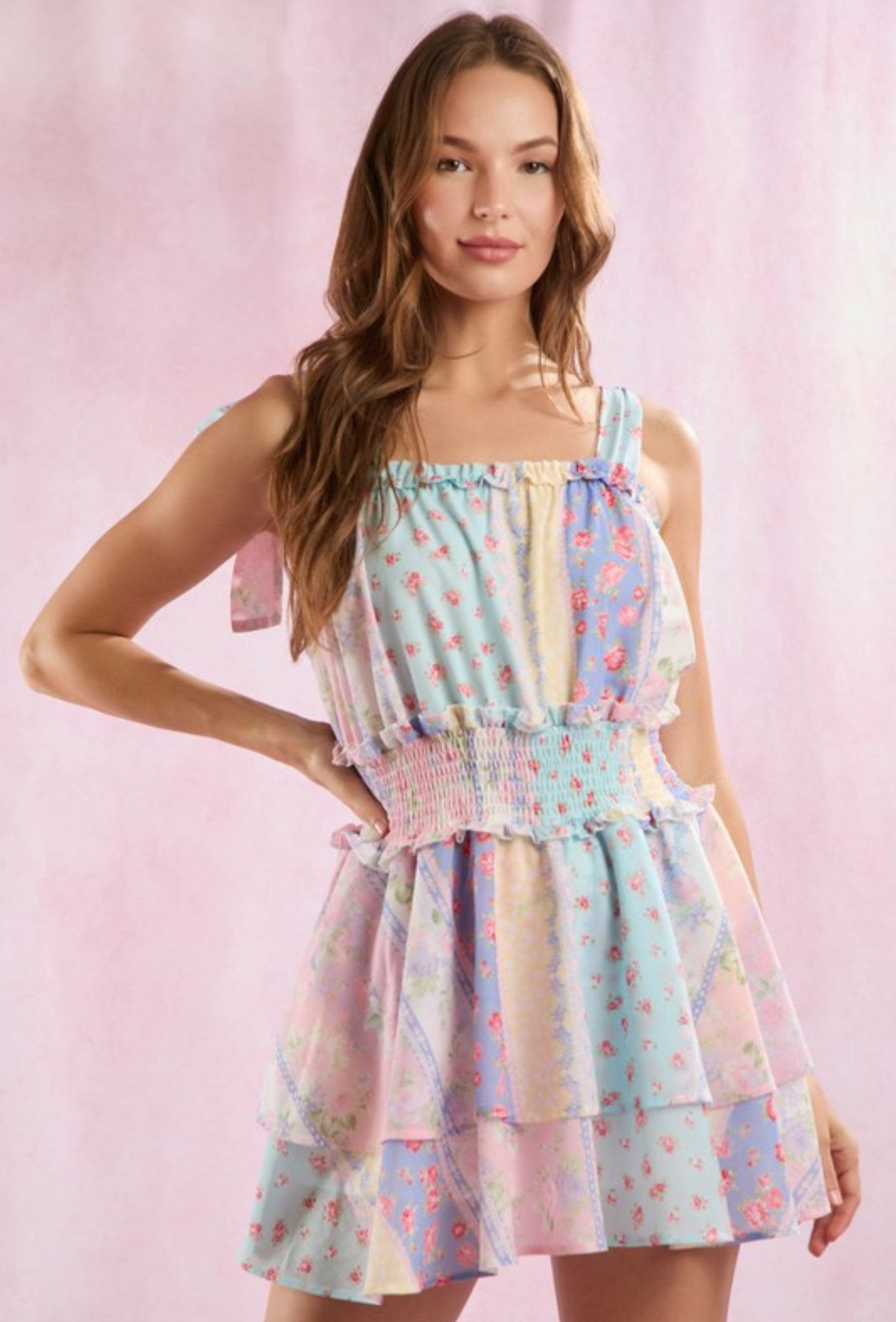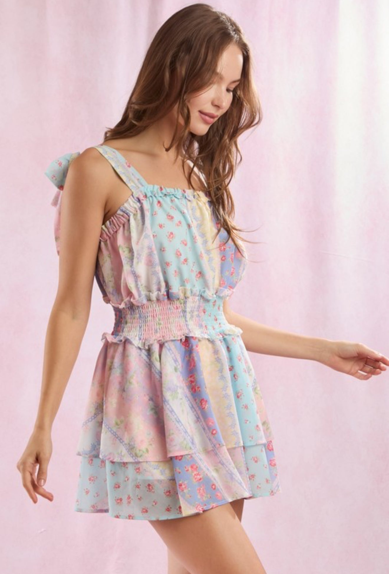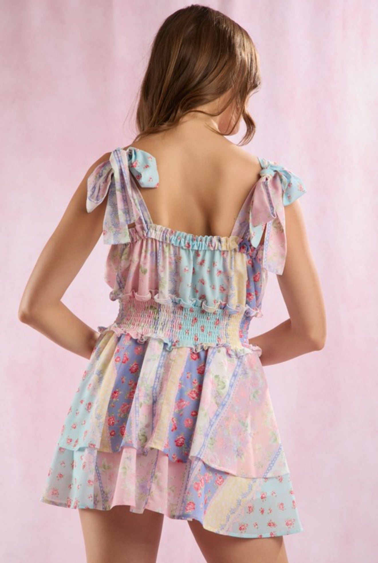 Step into your storybook summer with the Daydream Cottage romper – a dreamy mini made for garden strolls, cottage getaways, and sunlit afternoons. Featuring a whimsical pastel patchwork print, this tiered ruffle dress flatters with a smocked waistline and adjustable tie straps for the perfect fit. Lightweight and fully lined, it moves effortlessly with you from brunch to boardwalk. Feminine, flirty, and full of charm, this is the dress your warm-weather wardrobe’s been waiting for.