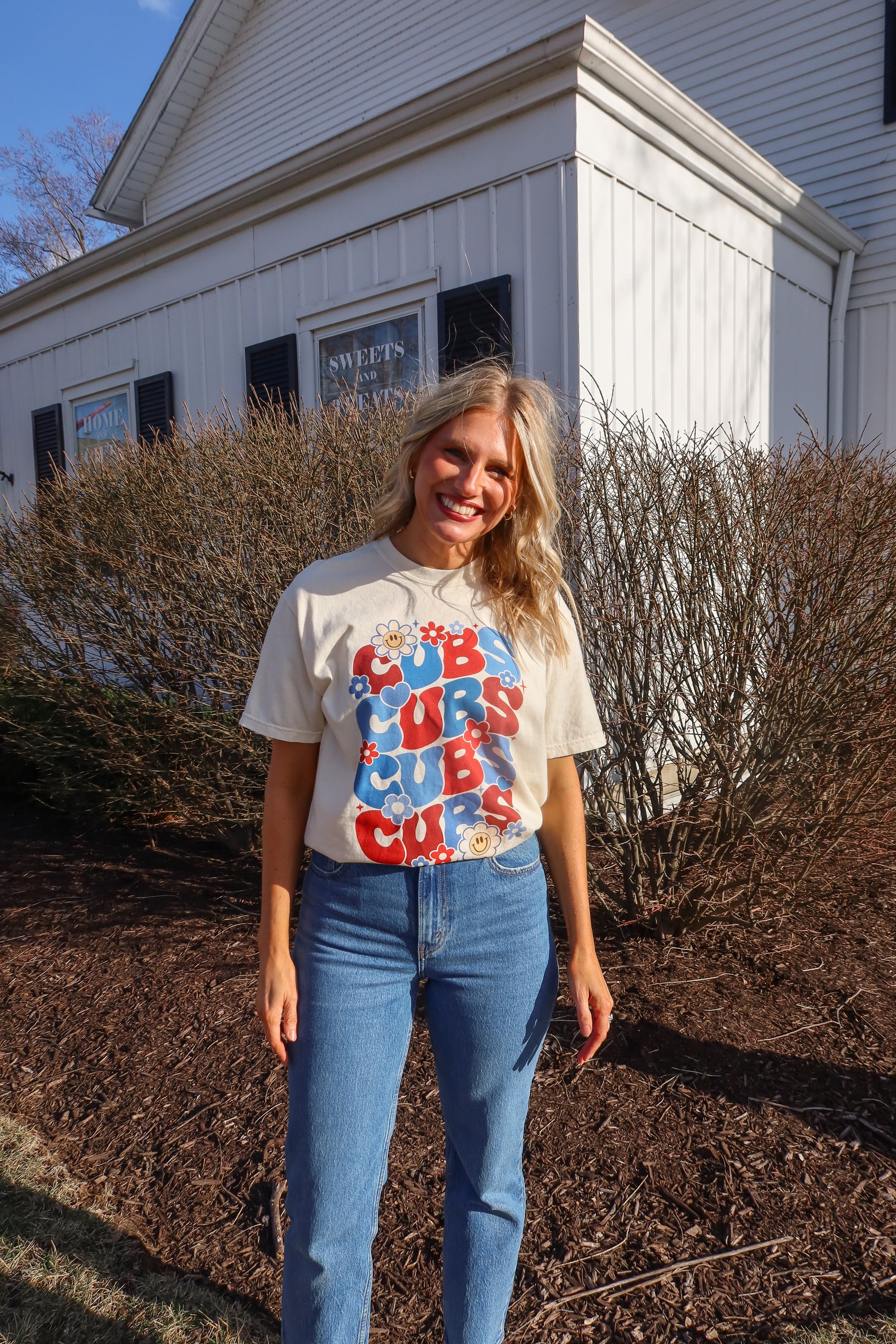 Cheer on the Cubs in the happiest tee around! The Go Cubs Tee brings all the vintage vibes with bold red and blue lettering, playful daisies, and the cutest little smiley details. It’s soft, comfy, and perfect for baseball season and beyond.
