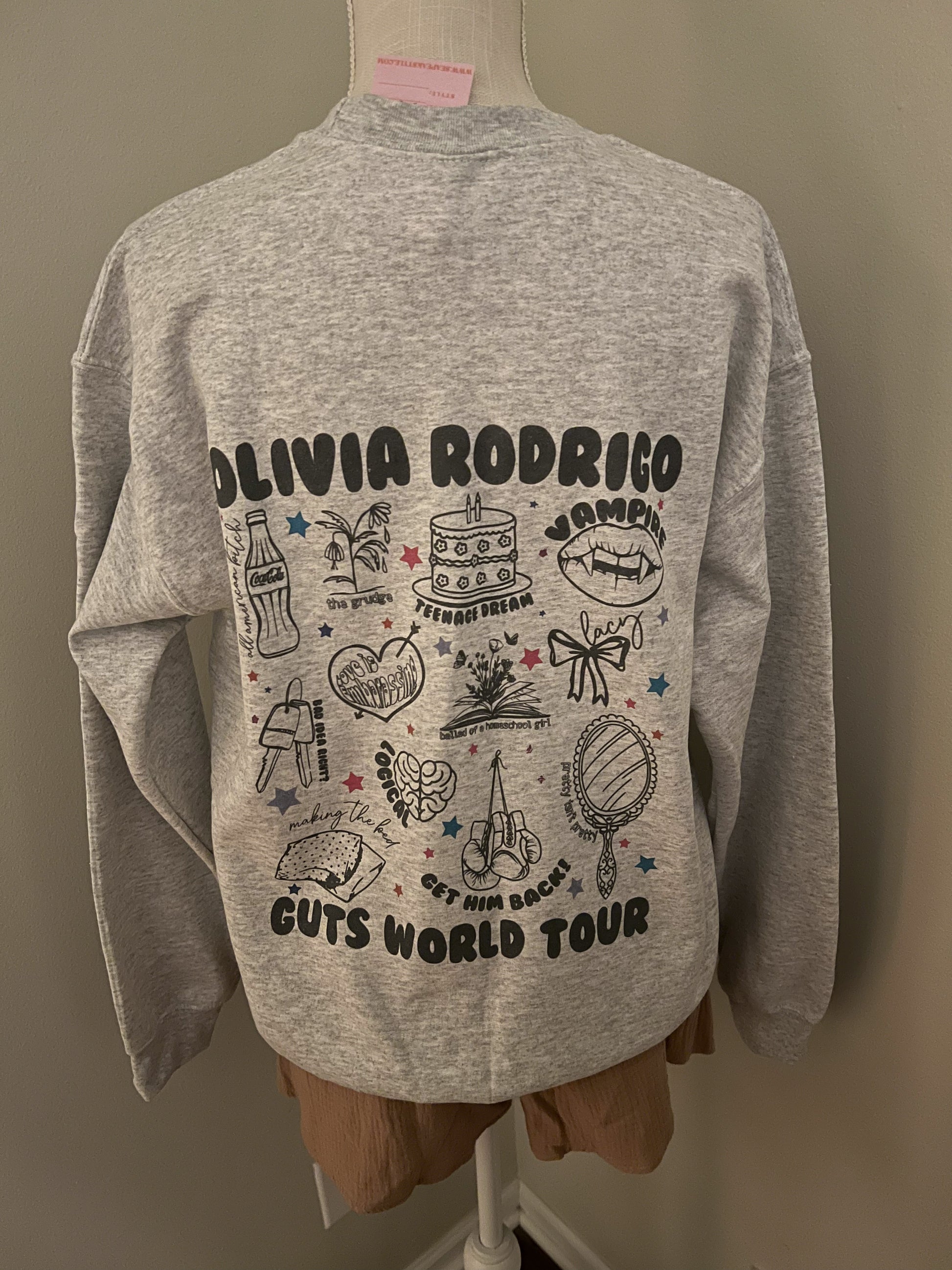 Join Olivia Rodrigo on the Guts world tour with this bold, eye-catching crew shirt. Featuring a track list on the back and a star graphic on the front, this shirt is perfect!
