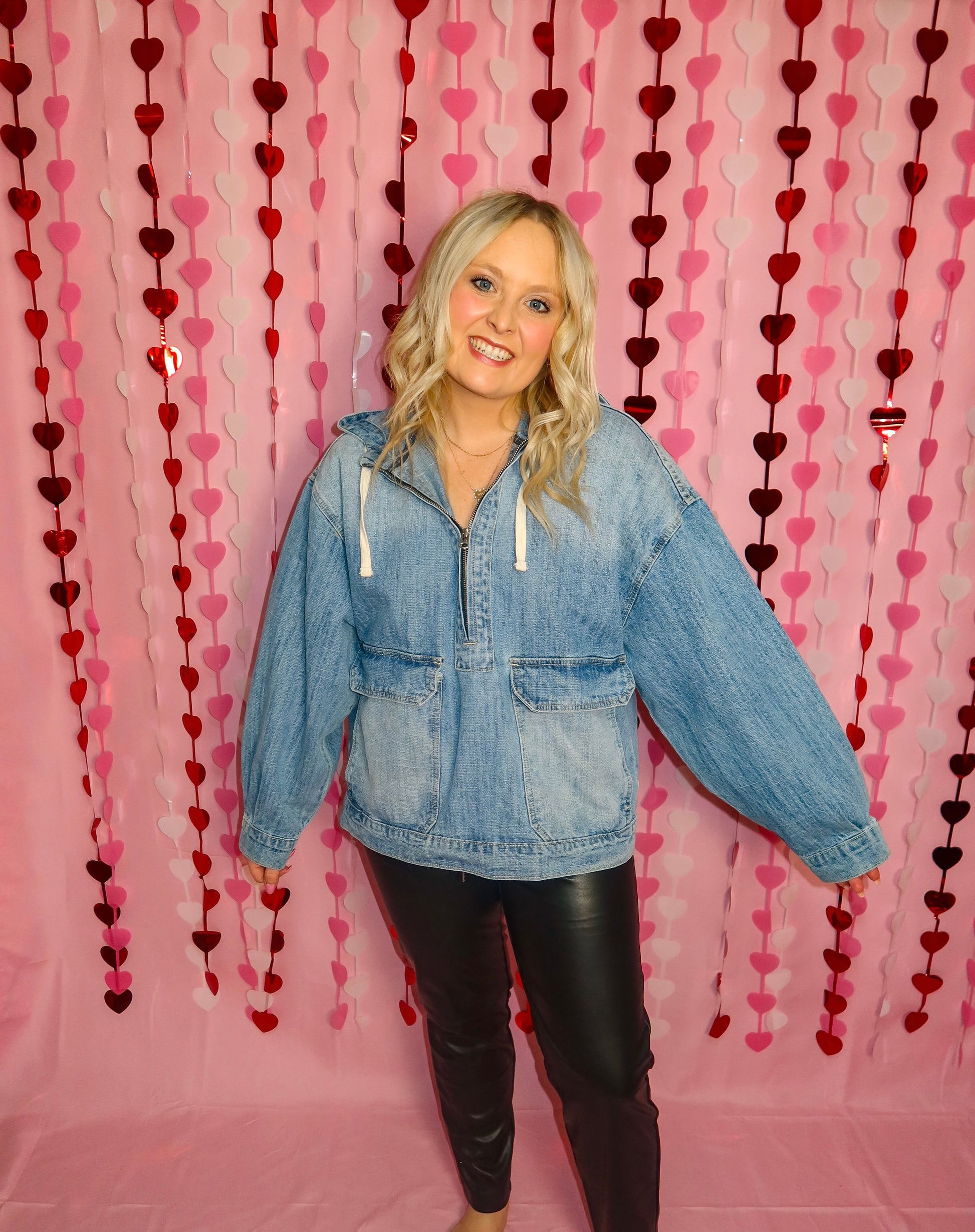 The Weekend Hooded Denim Jacket is your go-to layer for effortless, off-duty style. Designed with a soft, lightweight denim wash, this jacket features a relaxed oversized fit, cozy hood with adjustable drawstrings, and front utility pockets for an easy, lived-in feel. It combines the structure of a denim jacket with the comfort of your favorite hoodie—making it a must-have for everyday wear.