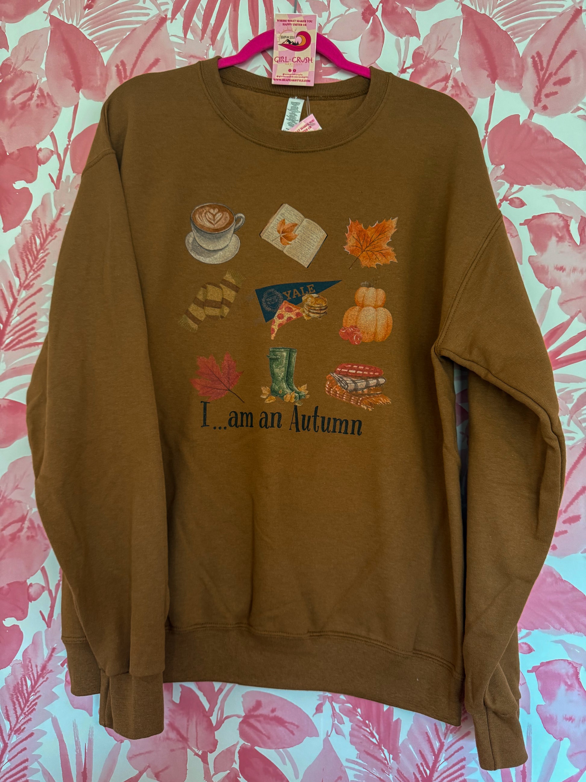 Channel your inner Stars Hollow vibes with the I Am an Autumn Crewneck, a cozy beige sweatshirt that feels straight out of a Gilmore Girls fall episode. The warm-toned retro graphic — complete with pumpkins, leaves, coffee, and cozy seasonal imagery — captures the exact mood of strolling through town square with a latte in hand. Perfect for pumpkin patch trips, apple orchard visits, fall festivals, or binge-watching your favorite episodes under a blanket. The neutral base makes it easy to style with jeans, leggings, or layered under a flannel for that classic Rory-and-Lorelai autumn look. A must-have for anyone who lives for crisp air, golden leaves, and coffee-fueled days.