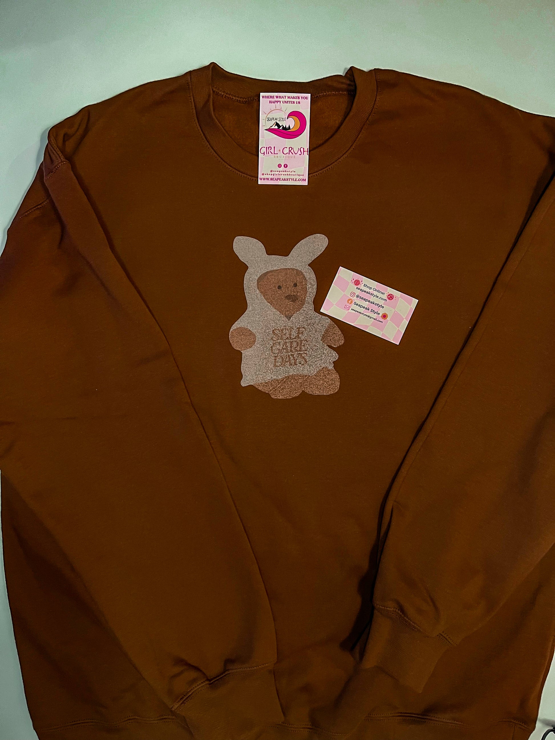 This deep brown crewneck sweatshirt features a soft and cozy design with a charming bunny graphic in gray tones. The bunny holds the message “Self-Care Days,” reminding wearers to prioritize rest and relaxation. Its minimalist yet heartwarming design pairs perfectly with the rich brown backdrop, making it a thoughtful addition to any wardrobe. Perfect for casual, comfortable days when self-care is the focus.