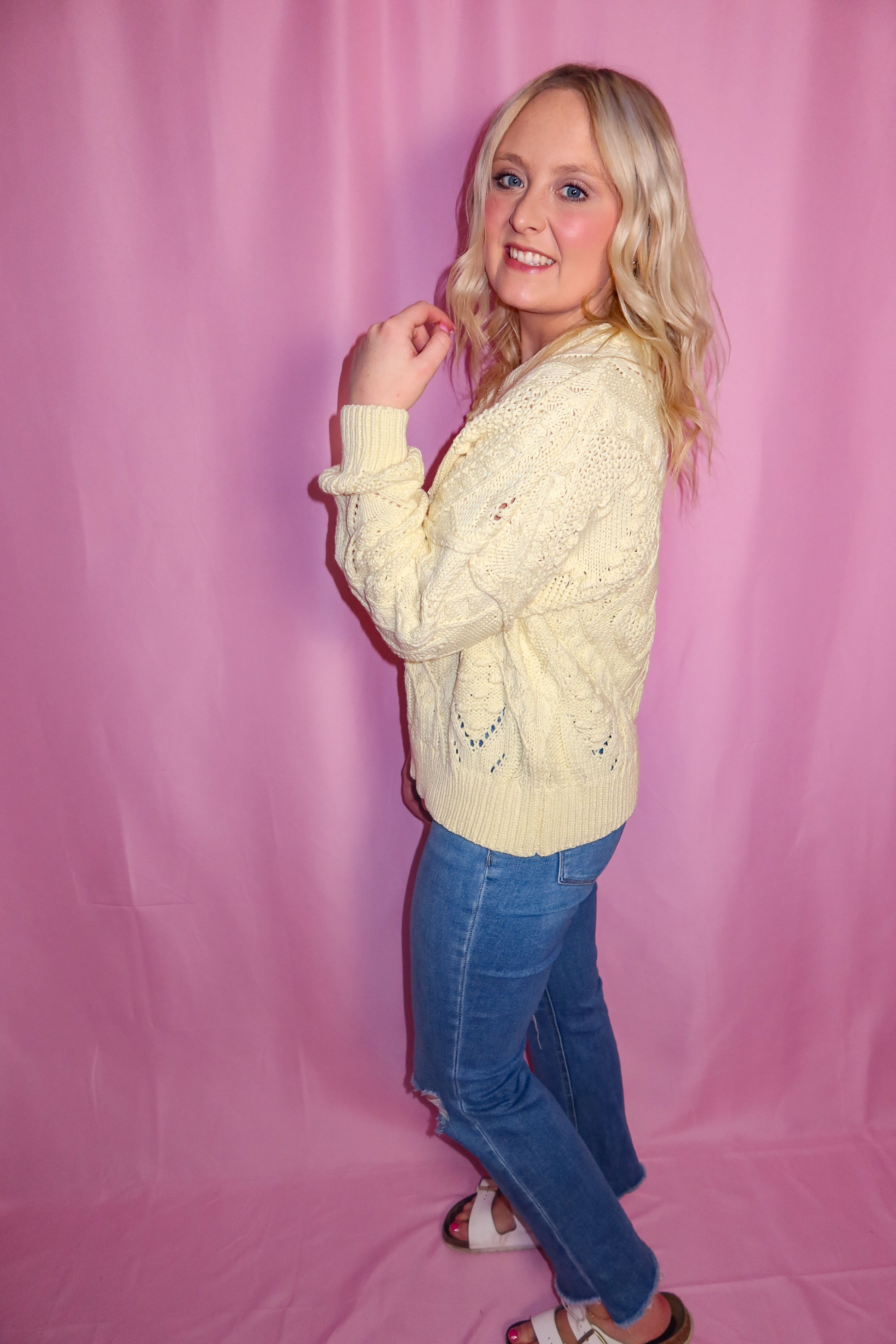 Soft, romantic, and timeless, The Love Letter Knit is the kind of sweater you’ll reach for again and again. Designed in a dreamy butter-yellow hue, this cable-knit sweater features intricate stitching throughout for a beautifully textured, elevated look. The relaxed fit and lightweight knit make it effortlessly wearable while still feeling special.