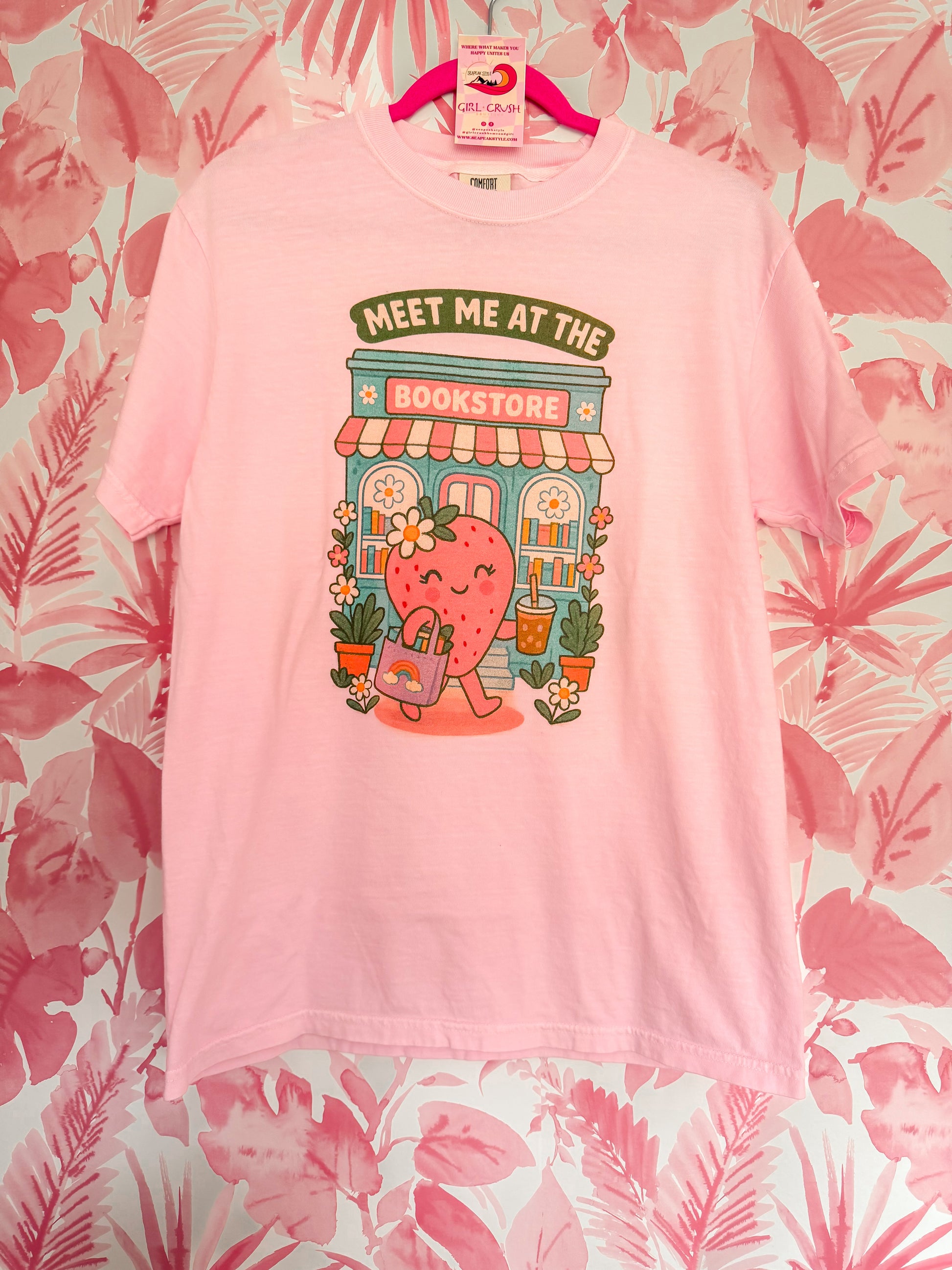 Sweet, bookish, and absolutely adorable—this tee is made for your next cozy day out. Featuring a cute strawberry character headed to their favorite indie bookshop (iced coffee and tote in hand, of course), this pastel pink tee is perfect for readers, romantics, and bookstore wanderers.