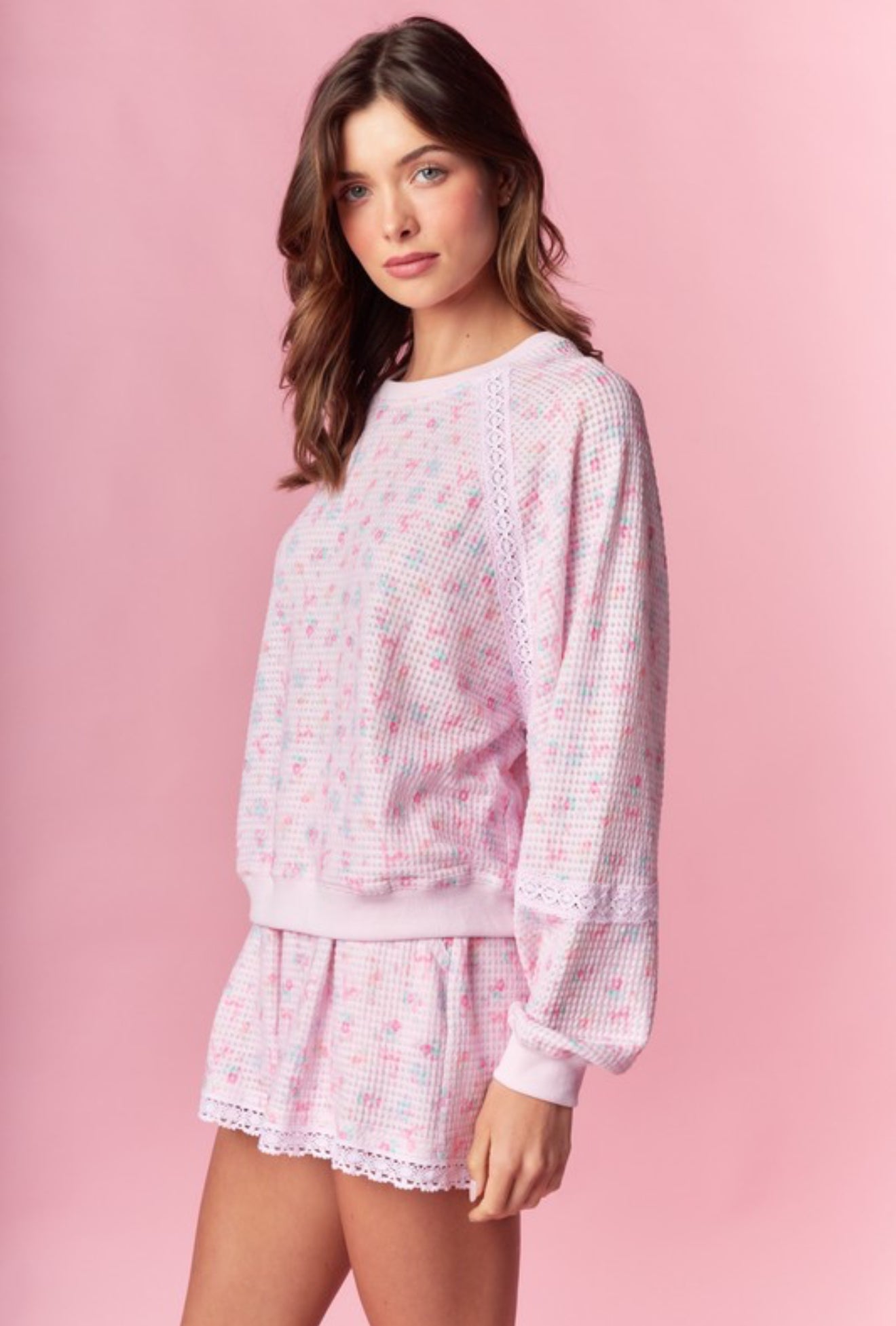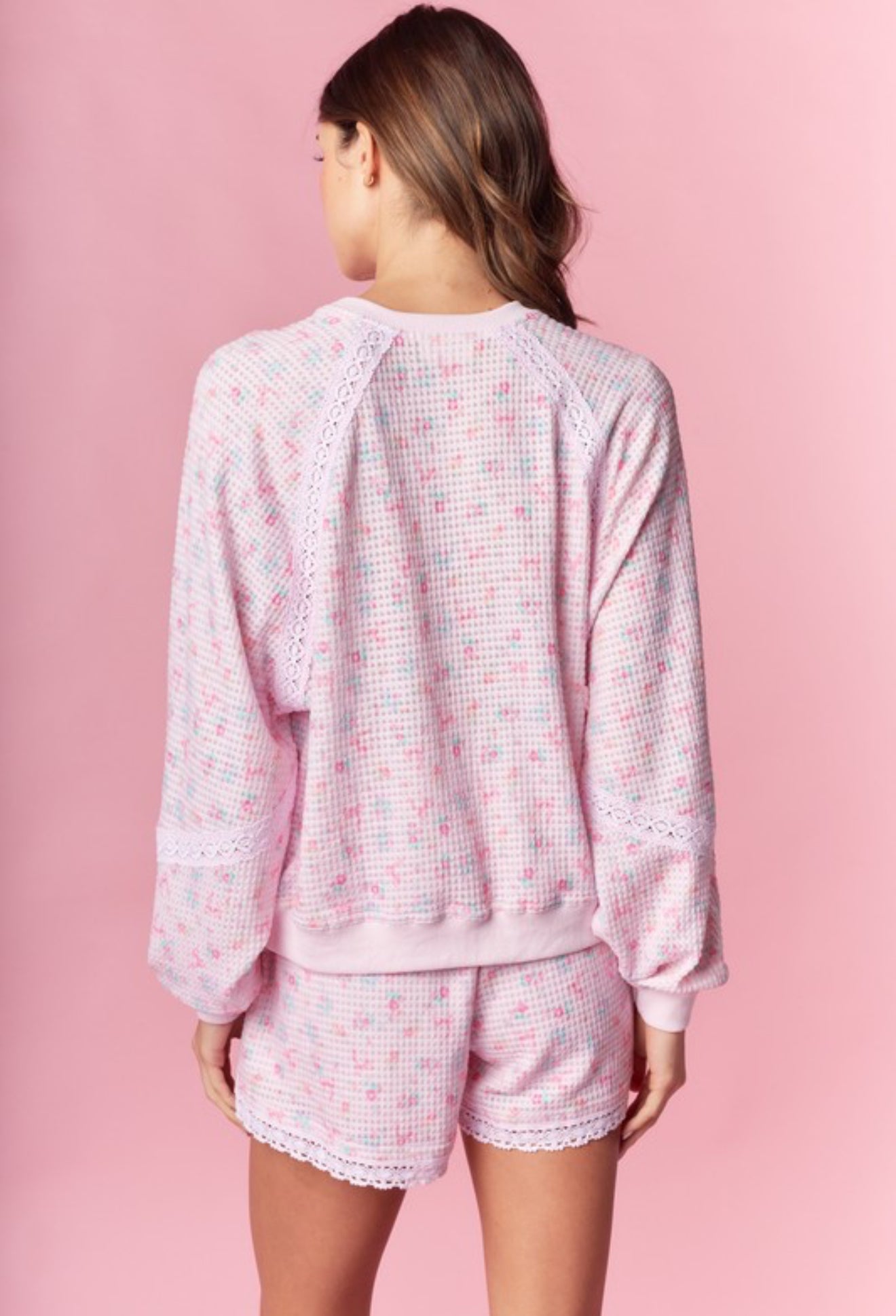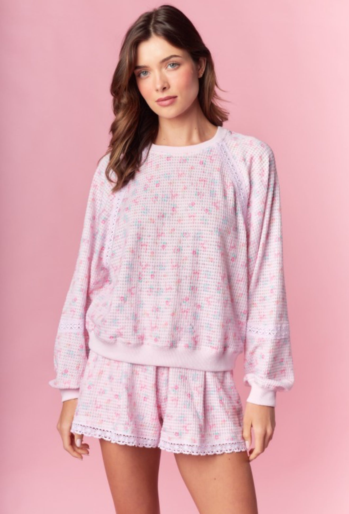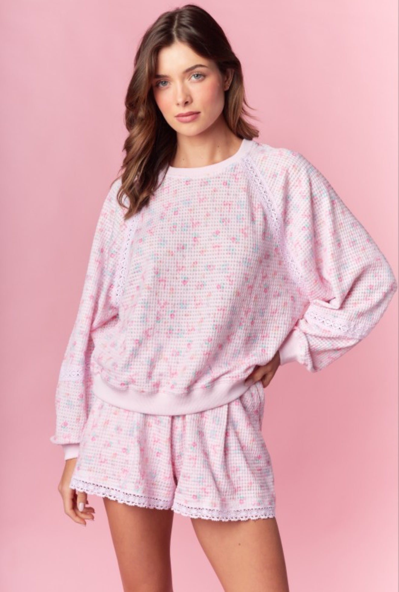 Soft, sweet, and made for slow mornings—the Morning Light Lounge Set is the definition of cozy comfort with a feminine touch. Designed in a dreamy blush pink waffle knit with delicate floral speckling, this set features a relaxed long-sleeve top and matching shorts trimmed with dainty lace details for an elevated lounge look.
