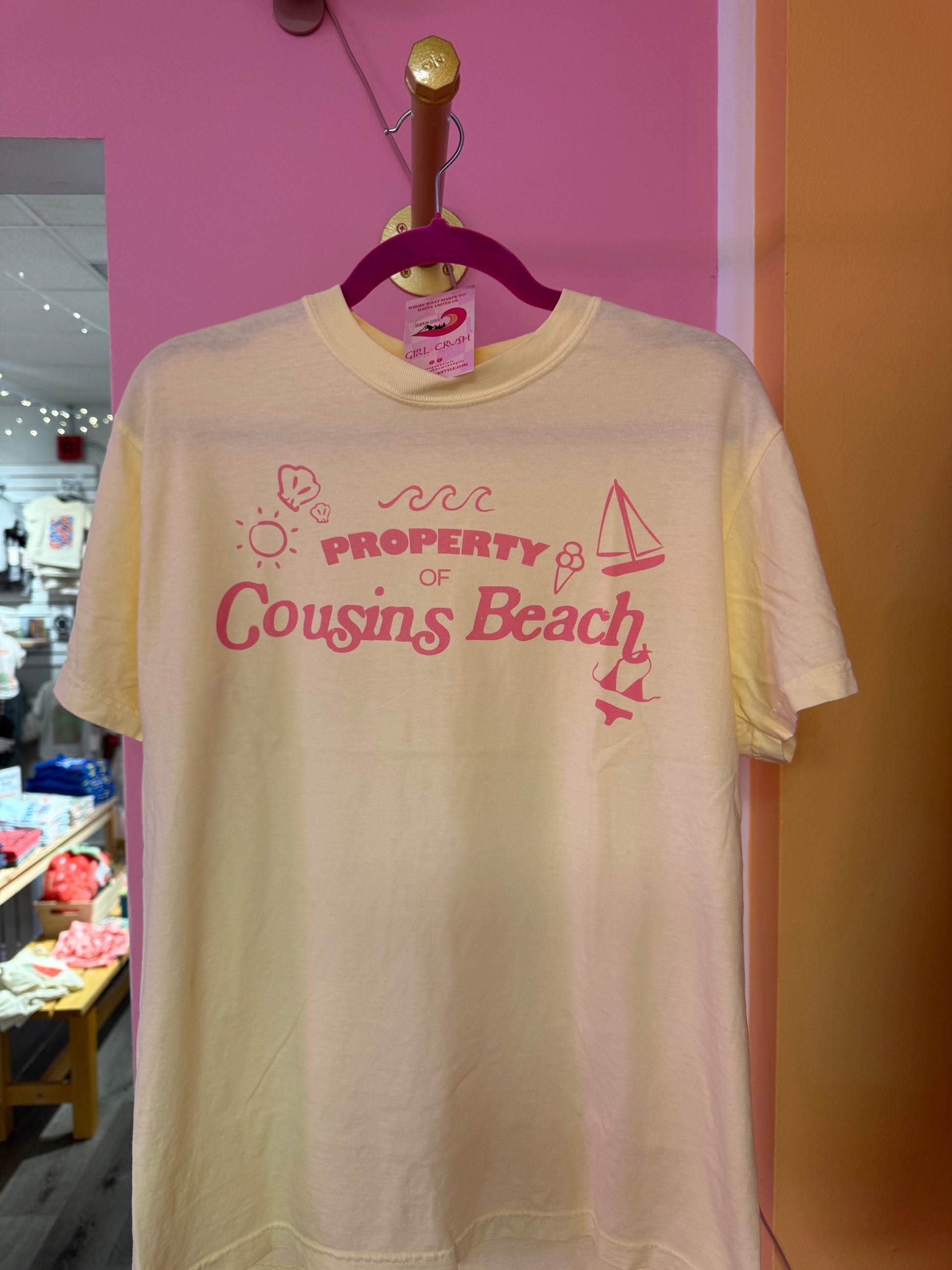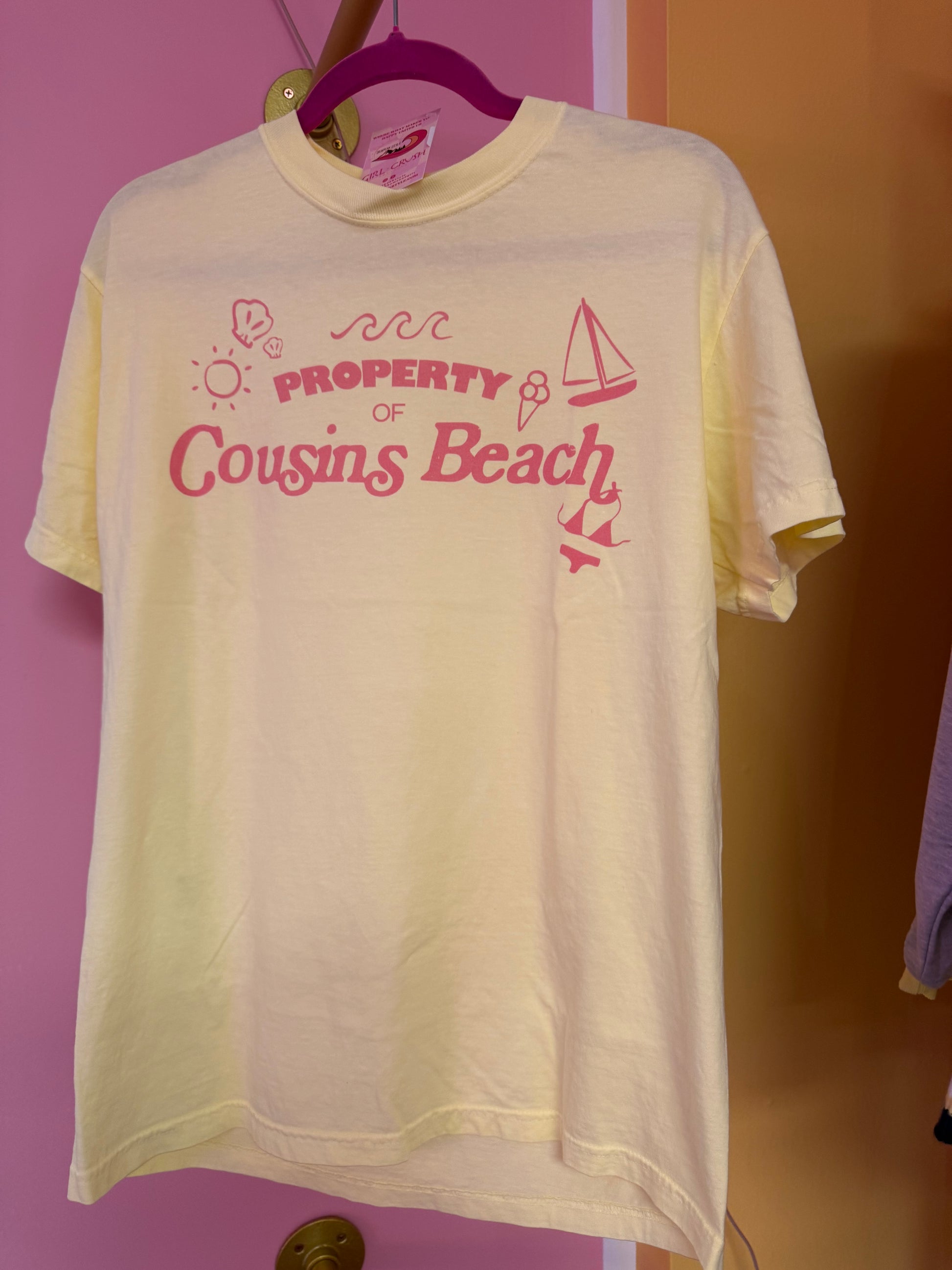 Calling all Summer I Turned Pretty fans—this tee was made for your next pool day or beach read binge. Featuring a soft butter-yellow base with bold retro pink lettering, this comfy graphic tee reads “Property of Cousins Beach” and is perfect for showing your Team Conrad or Team Jeremiah pride. Lightweight, easy to style, and ideal for summer lounging—whether you’re on the coast or just dreaming of it.
