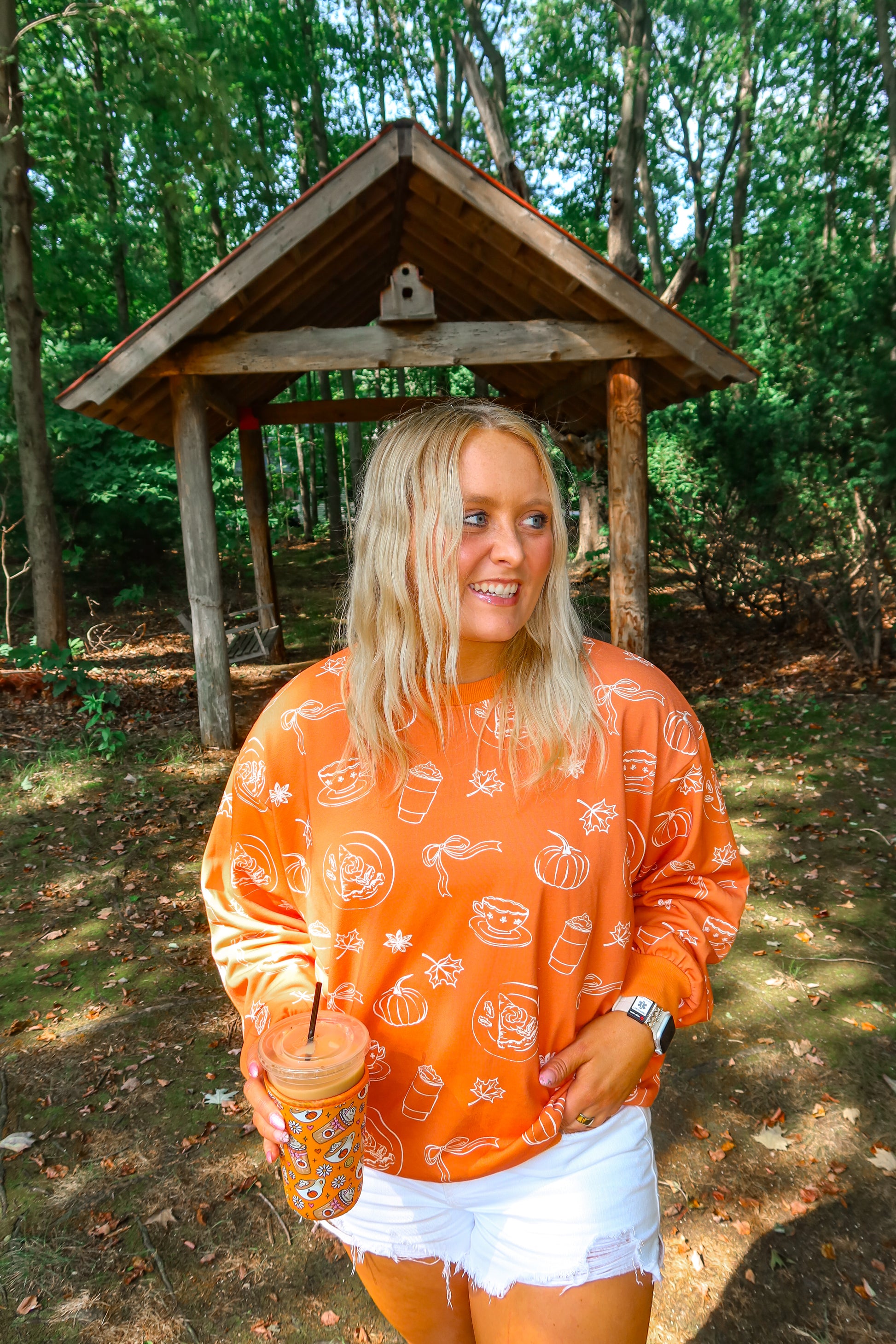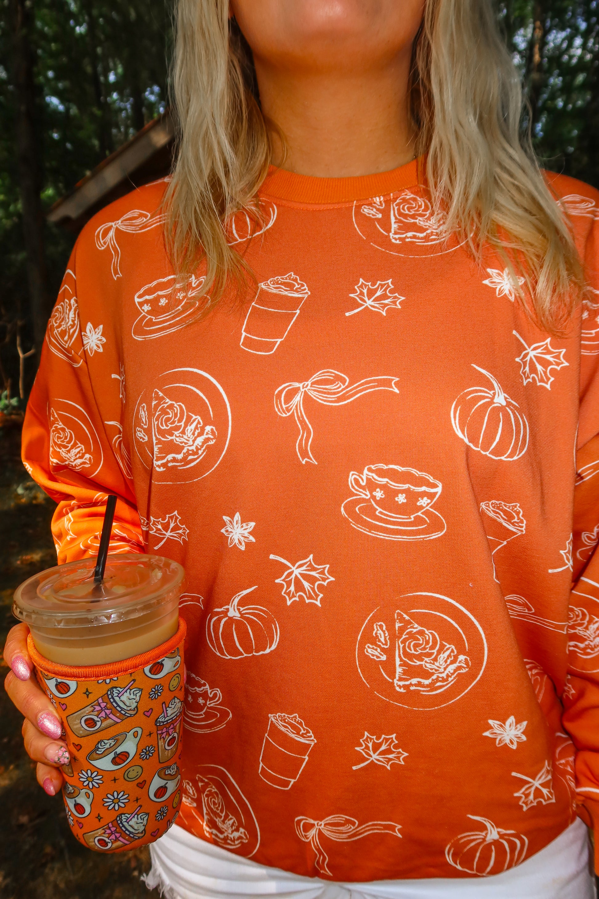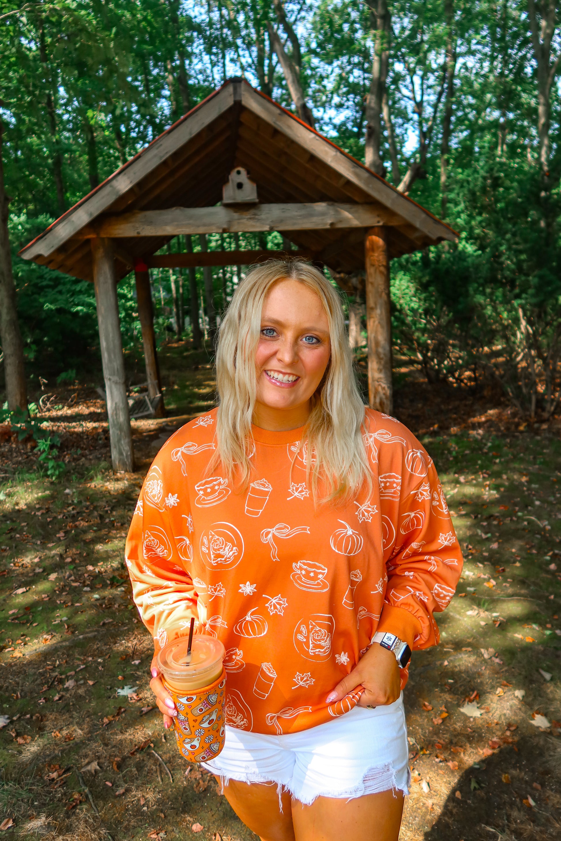 Fall in love with cozy season in this pumpkin-orange crewneck, designed for all your autumn adventures. Featuring playful hand-drawn graphics of pumpkins, lattes, pie slices, fall leaves, and cozy mugs, this sweatshirt is the perfect mix of festive and comfy. The relaxed oversized fit makes it ideal for coffee runs, pumpkin patch days, or lounging on crisp fall evenings.