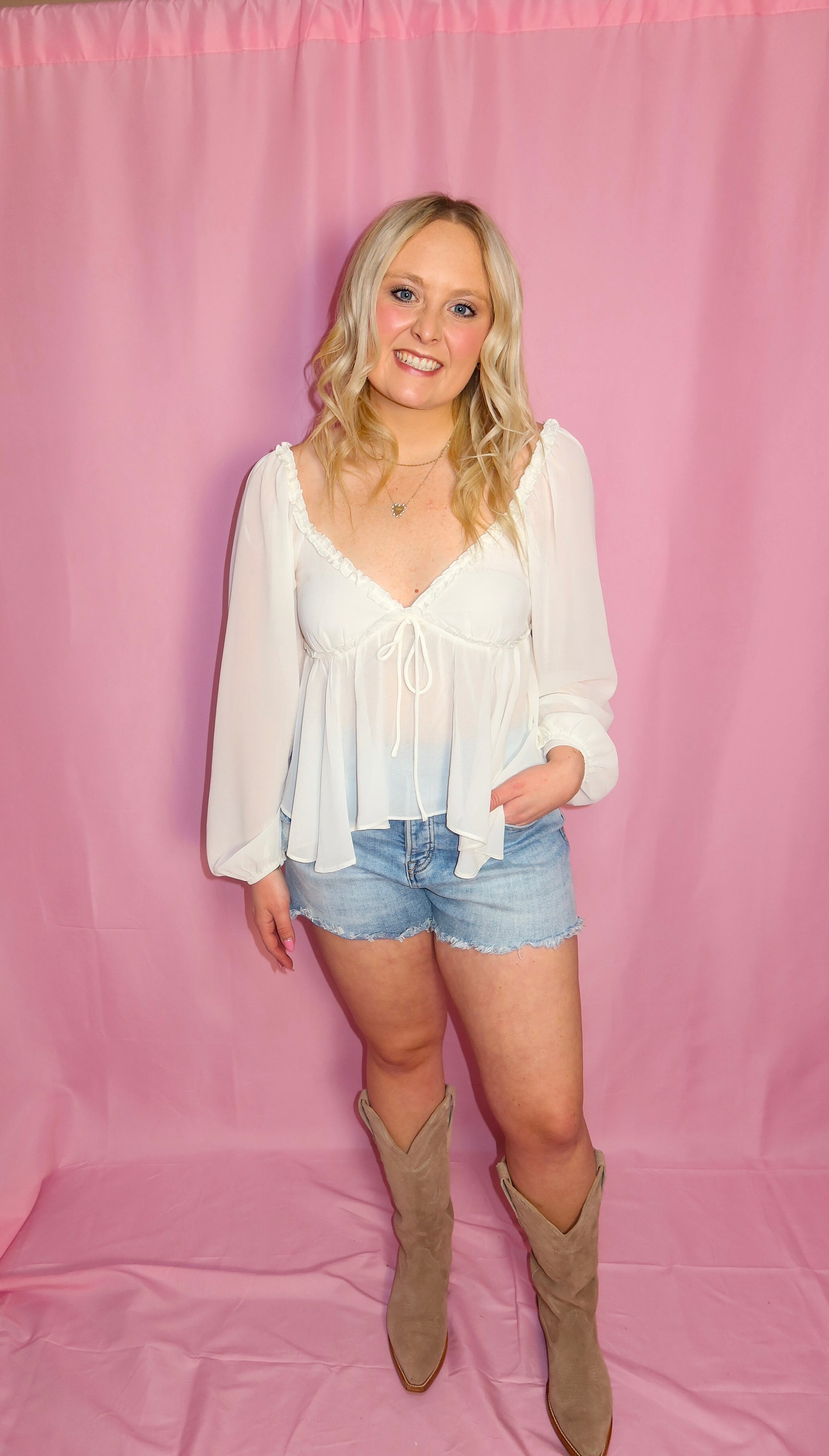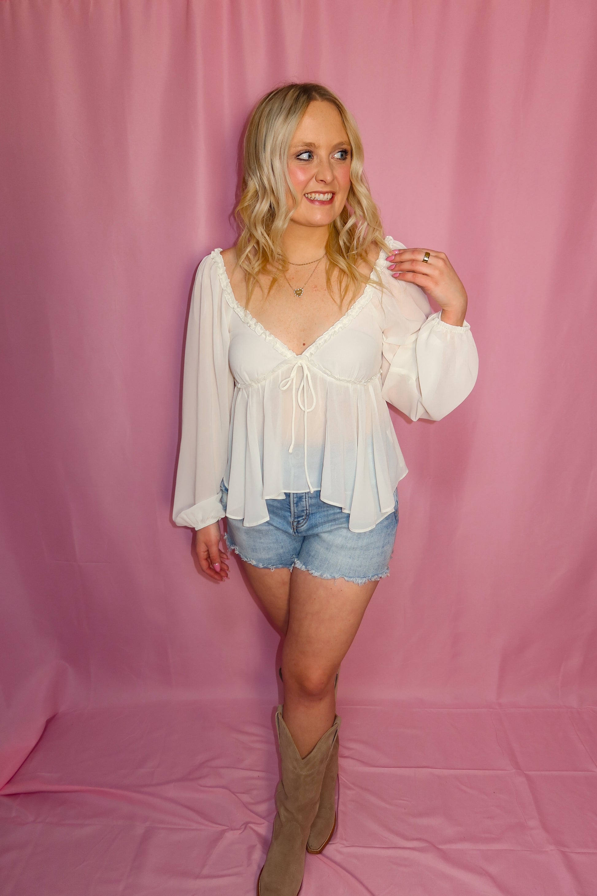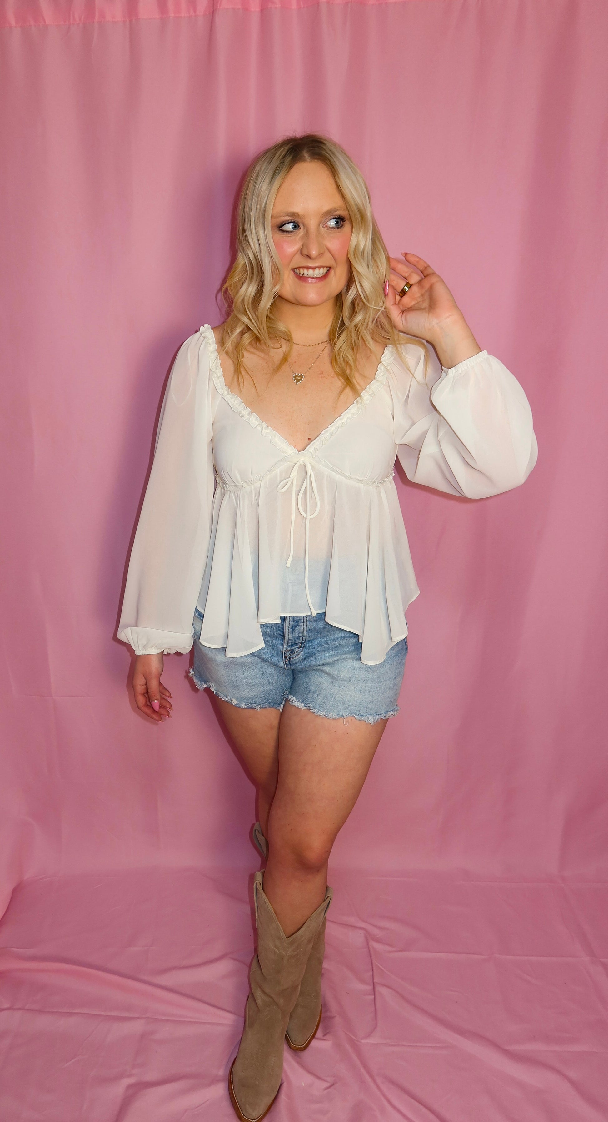 Romantic, flirty, and made for special moments, the Miss Me More Top is the ultimate statement blouse for nights out and country concerts alike. Designed in a soft ivory chiffon, this top features a feminine V-neckline with delicate ruffle trim, a dainty front tie, and flowy long sleeves that add effortless movement. The lightweight, sheer overlay creates a dreamy silhouette that feels elevated yet easy to wear.