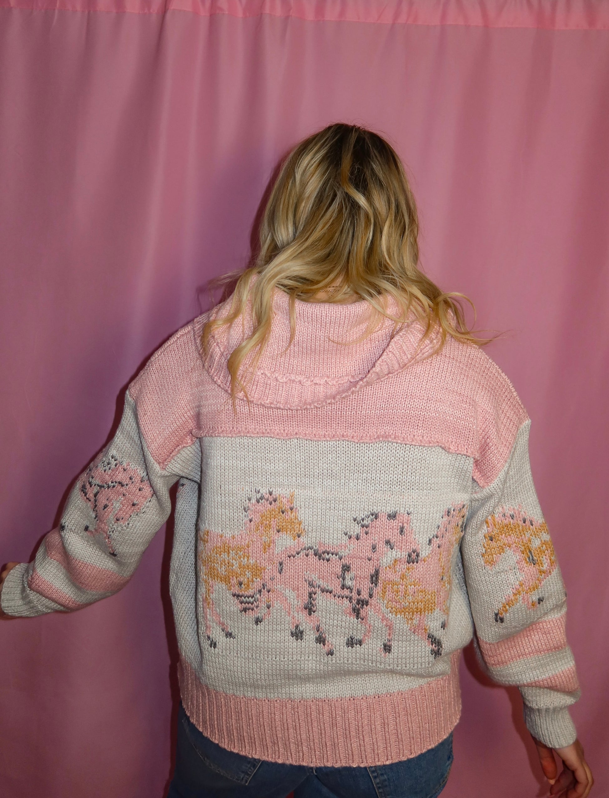 The Running Free Knit Cardigan is a cozy statement piece designed to stand out while still feeling effortless. Featuring a soft knit fabrication with an all-over running horse pattern in blush pink, ivory, and warm neutral tones, this cardigan has a dreamy, vintage-inspired feel we love.