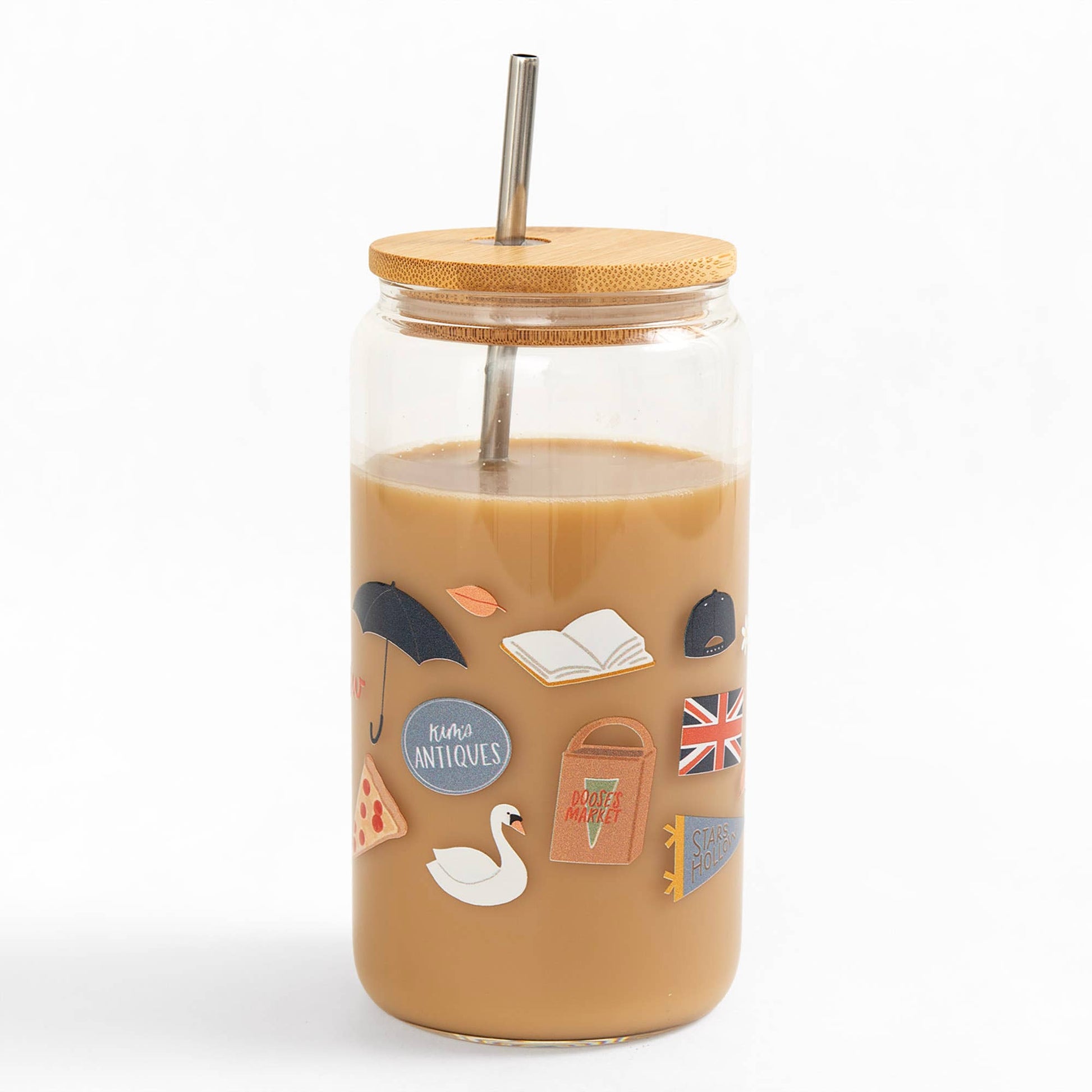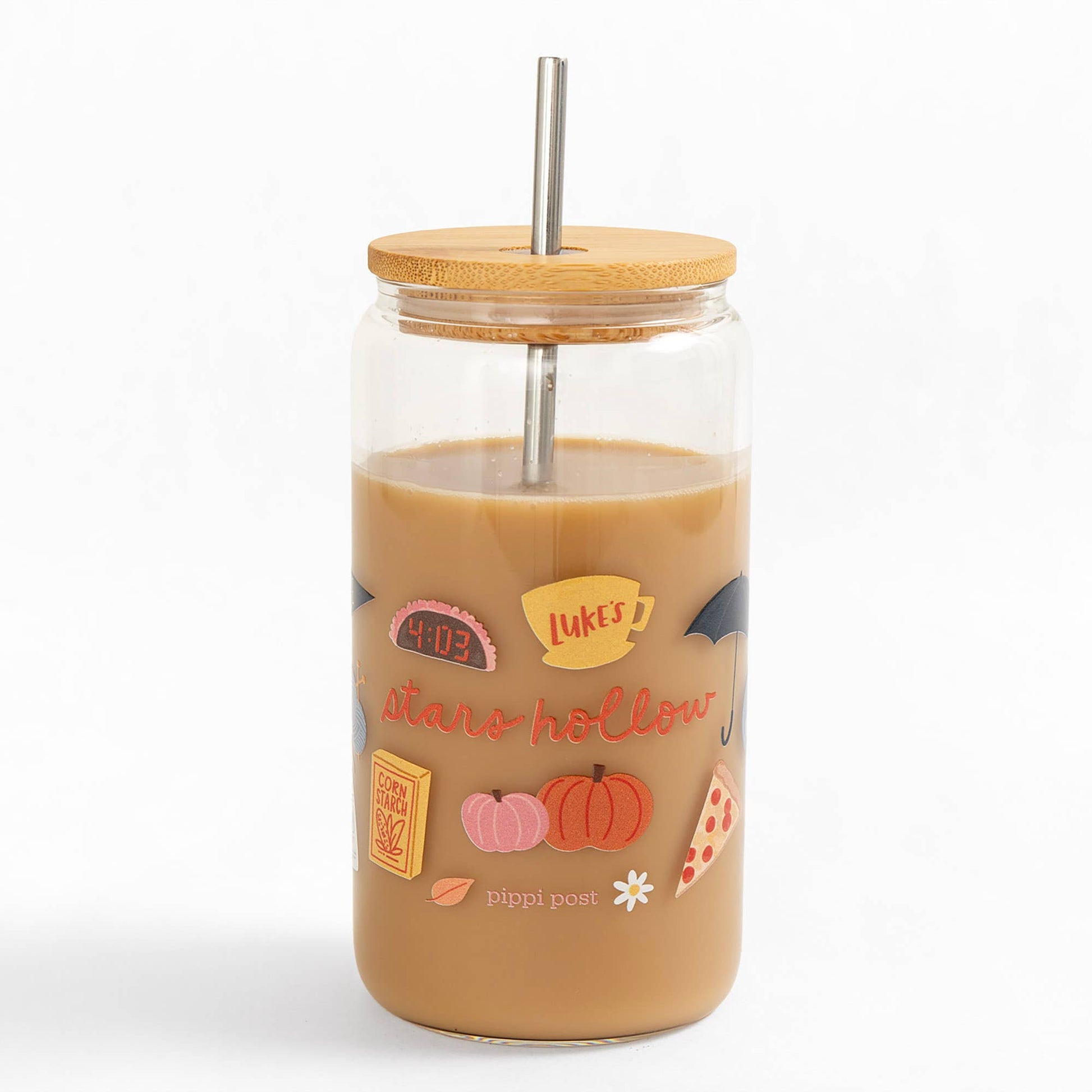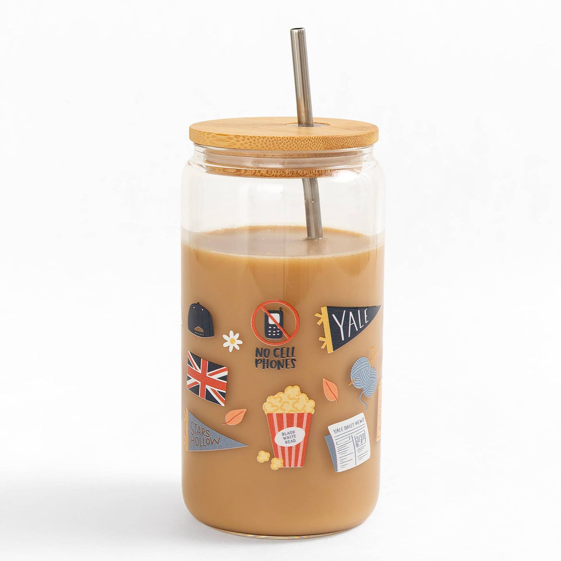 Bring a piece of Stars Hollow to your beverage with our Stars Hollow in the Fall Glass Can! Featuring charming hand-illustrated icons from Gilmore Girls, including a Yale banner, pumpkins, a book, umbrella, swan, pizza, and more, this glass can captures the cozy spirit of the beloved show. Whether you're sipping your morning coffee, afternoon tea, or a refreshing sparkling water, let the nostalgia of Stars Hollow accompany you. Ideal for Gilmore Girls fans or anyone who loves small-town charm, our Stars Hollow in the Fall Glass Can makes a great gift for birthdays, holidays, or any special occasion. • Material: Glass • Holds: 16oz • Bamboo lid & straw included • Hand wash only