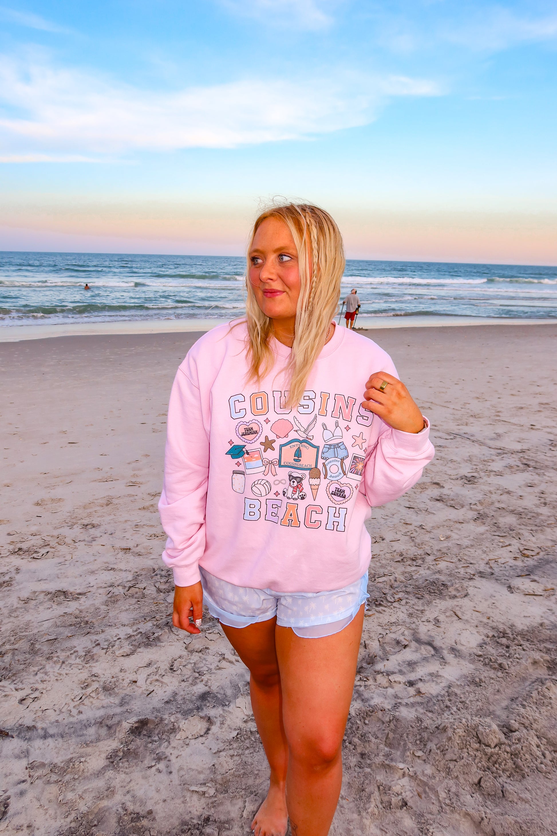 Escape to your happy place—no plane ticket required. Our Cousins Beach sweatshirtbrings all the summer vibes in one soft, pink package. Inspired by sun-soaked days and salty hair, this design features playful icons—beach signs, ice cream, volleyball, seashells, and even Junior Mint the polar bear—plus cheeky nods to both Team Conrad and Team Jeremiah for die-hard TSITP fans.