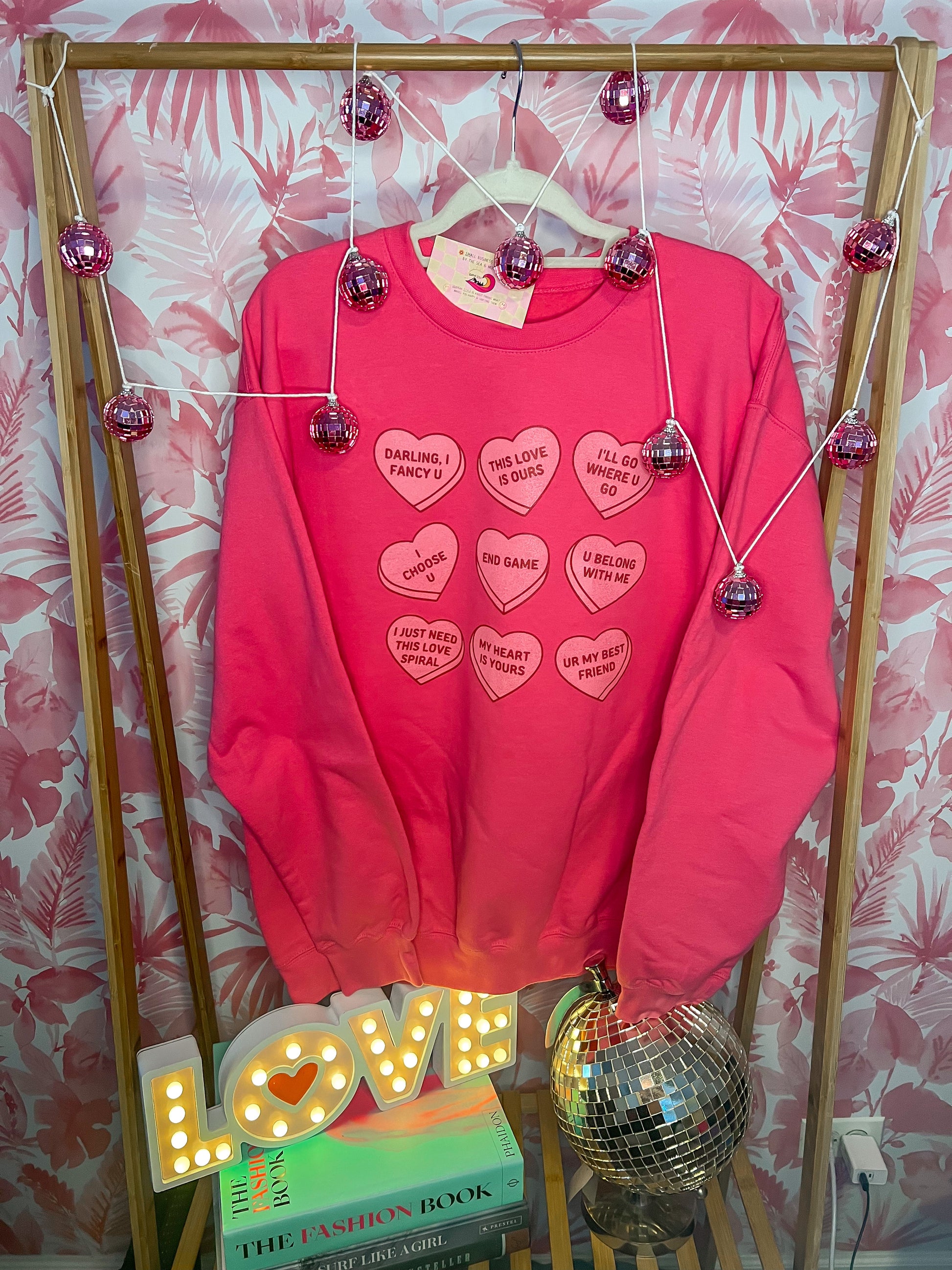 Get ready to show your love for Taylor Swift with Swift Love! This pink, soft sweatshirt is adorned with conversation hearts and lyrics from Taylor's iconic songs. The cute pink hearts add a sweet touch to this perfect outfit for any Swiftie. Love, love, love it!