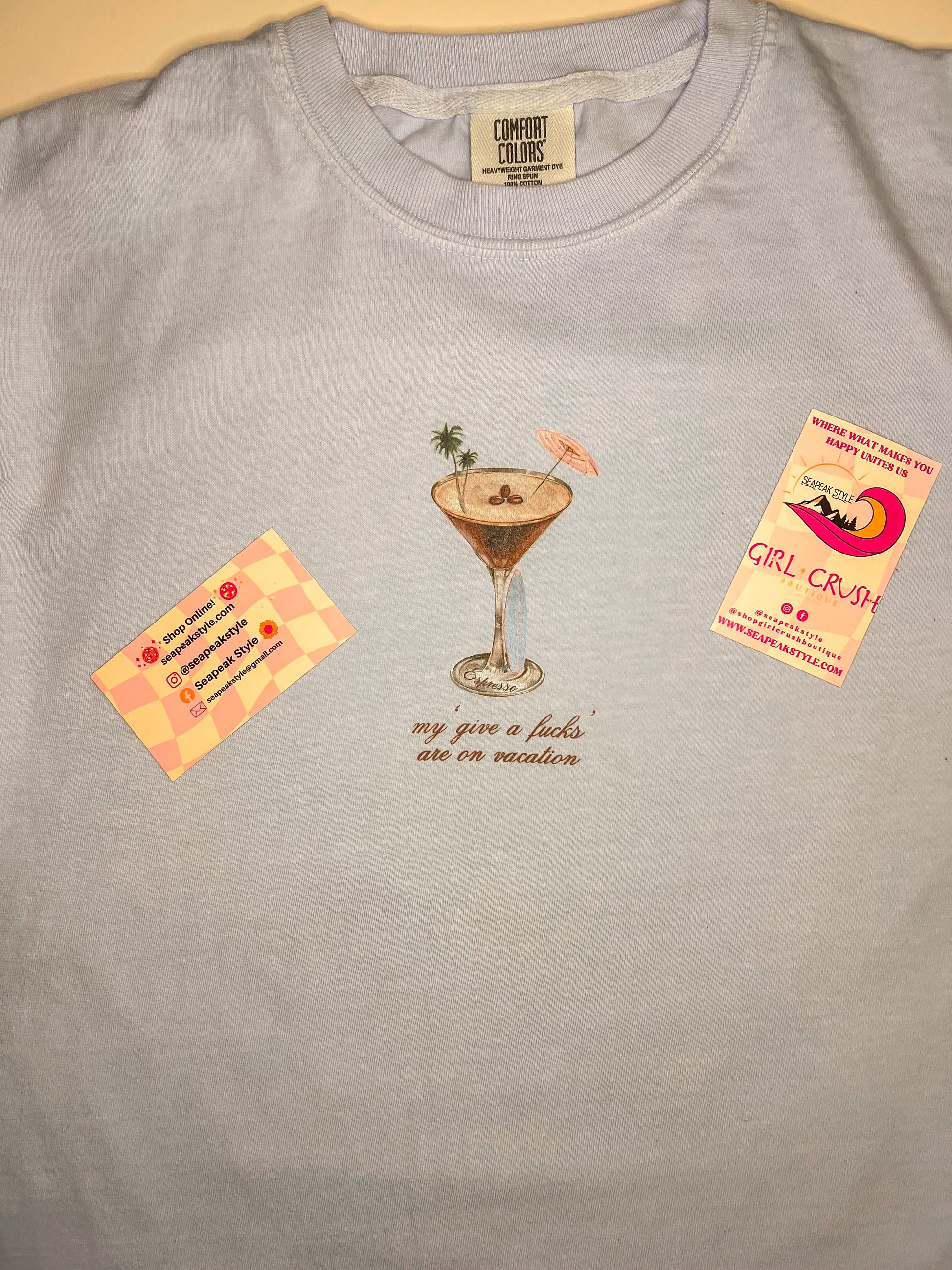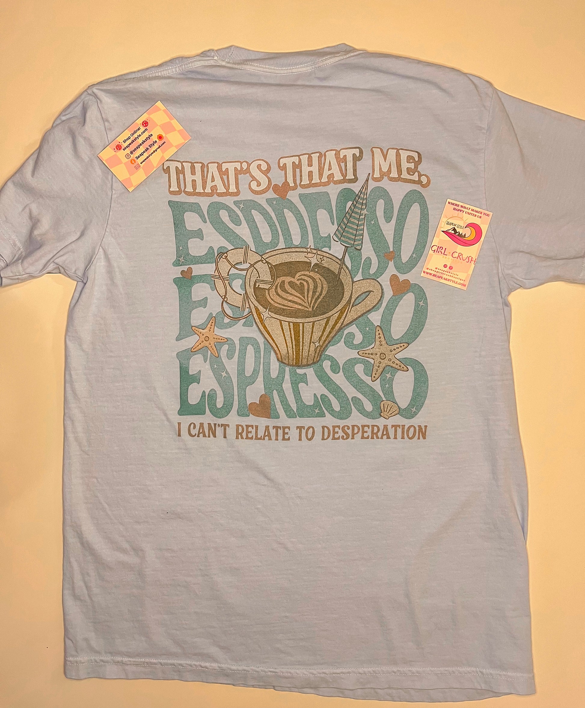 A light blue tee inspired by Sabrina Carpenter's playful personality and witty lyrics. Featuring the phrase "That's That Me, Espresso Espresso Espresso—I Can't Relate to Desperation" with charming coffee and beach-inspired graphics like seashells and starfish. The back showcases a chic espresso martini with the cheeky tagline "My give a f***s are on vacation." A perfect choice for fans of fun, carefree vibes and a touch of caffeine humor.