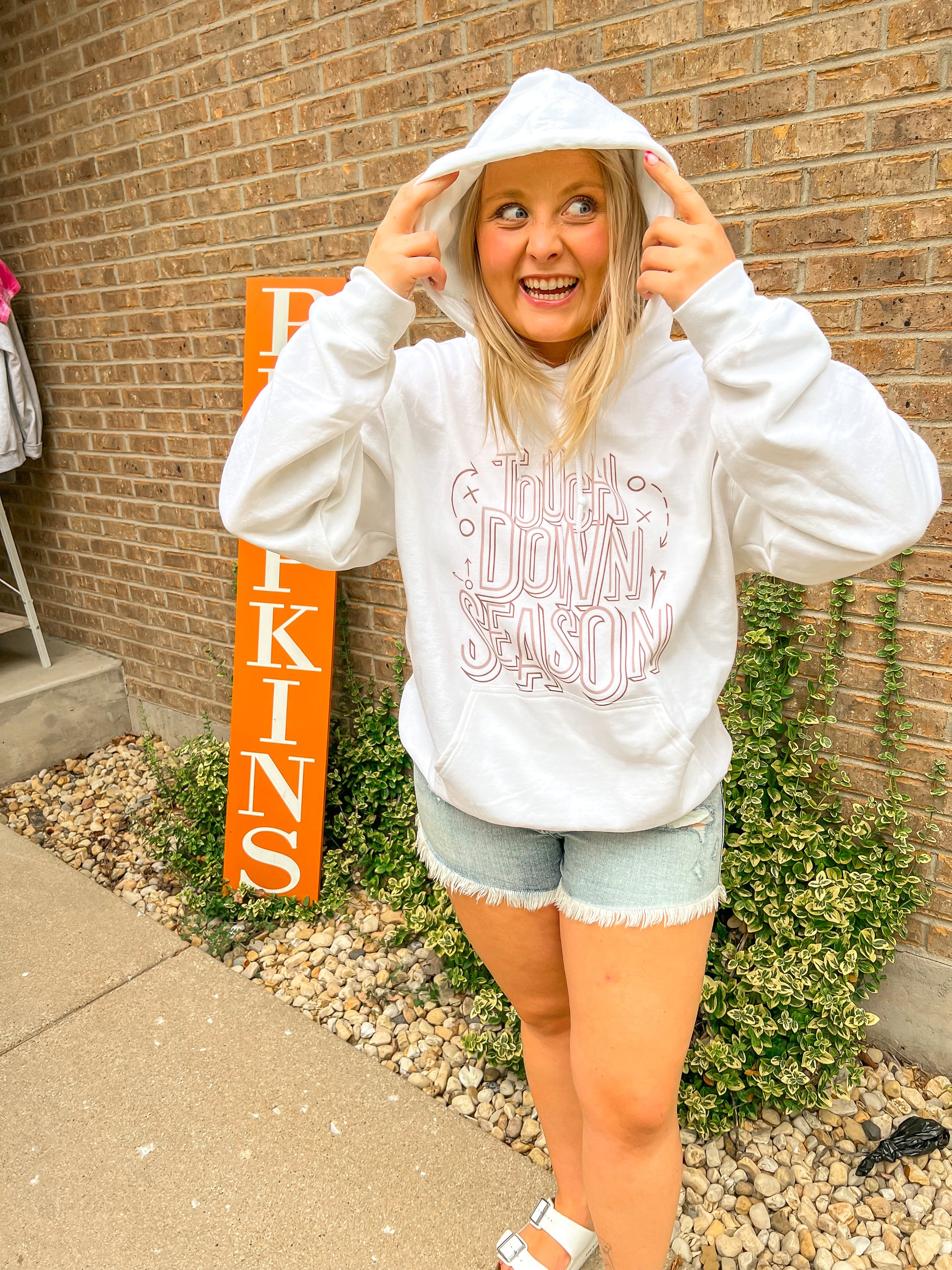 Score points in style with this Touchdown Season Hoodie! Show your love for the football season with this white hoodie perfect for any fall outfit. Celebrate each touchdown in comfort and flair! Go, team!