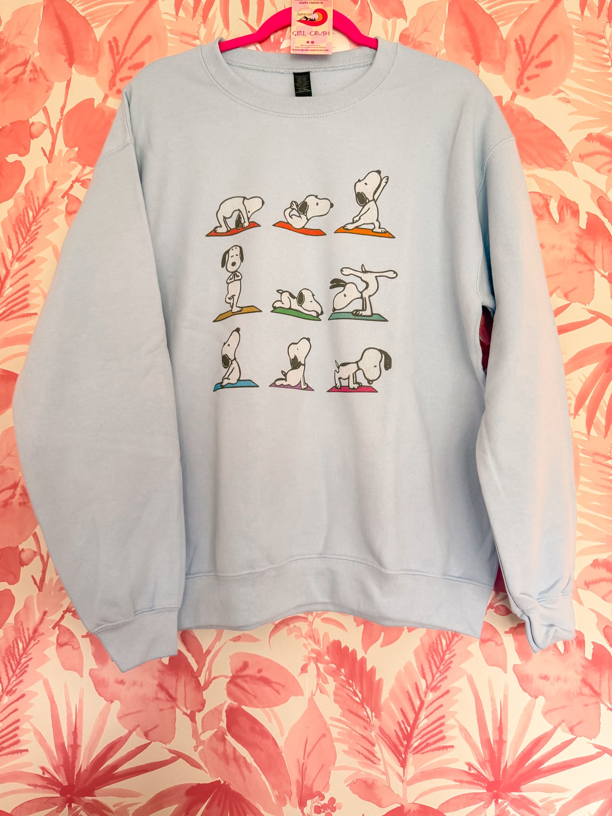 Namaste, but make it cute. This cozy light blue crewneck features everyone’s favorite beagle—Snoopy—striking a pose (well, several poses) on colorful yoga mats. Whether you’re a true yogi or just stretching your way through life, this sweatshirt adds a dose of humor and charm to your comfy wardrobe.