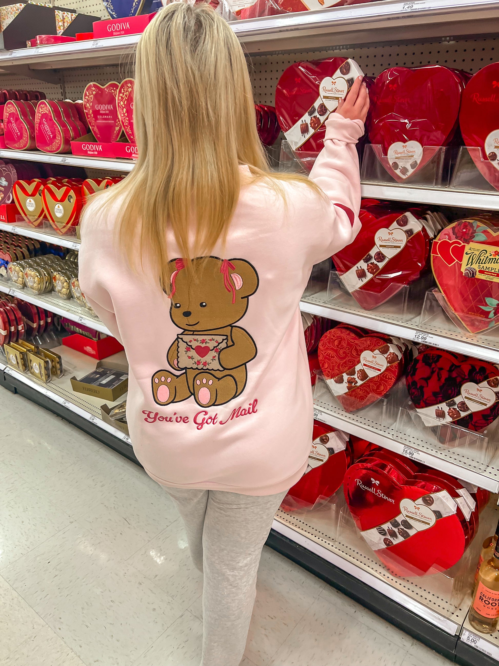 This adorable pink crewneck sweatshirt features a charming embroidered teddy bear design holding an envelope adorned with hearts, accompanied by the playful text "You've Got Mail" in elegant script. The sleeve adds an extra sweet touch with the phrase "Sincerely Yours" embroidered in matching pink. Perfect for cozy days, it combines comfort and cuteness, making it an ideal choice for those who love a whimsical, heartfelt style.